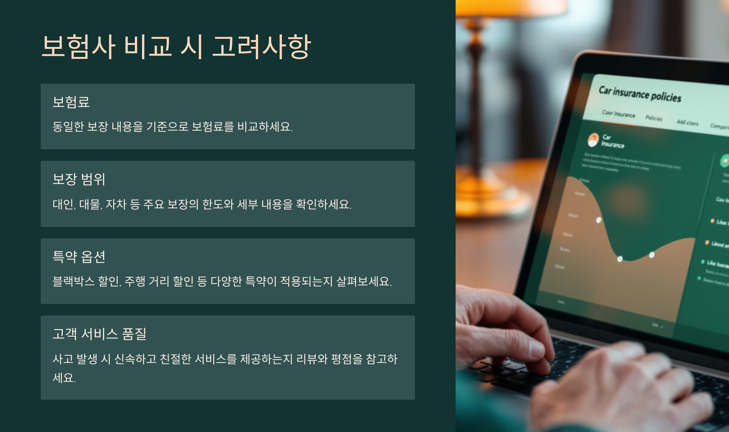 다음으로는 더 합리적인 선택을 위해 **보험사 비교 시 고려사항**을 알려드릴게요.💡🚗