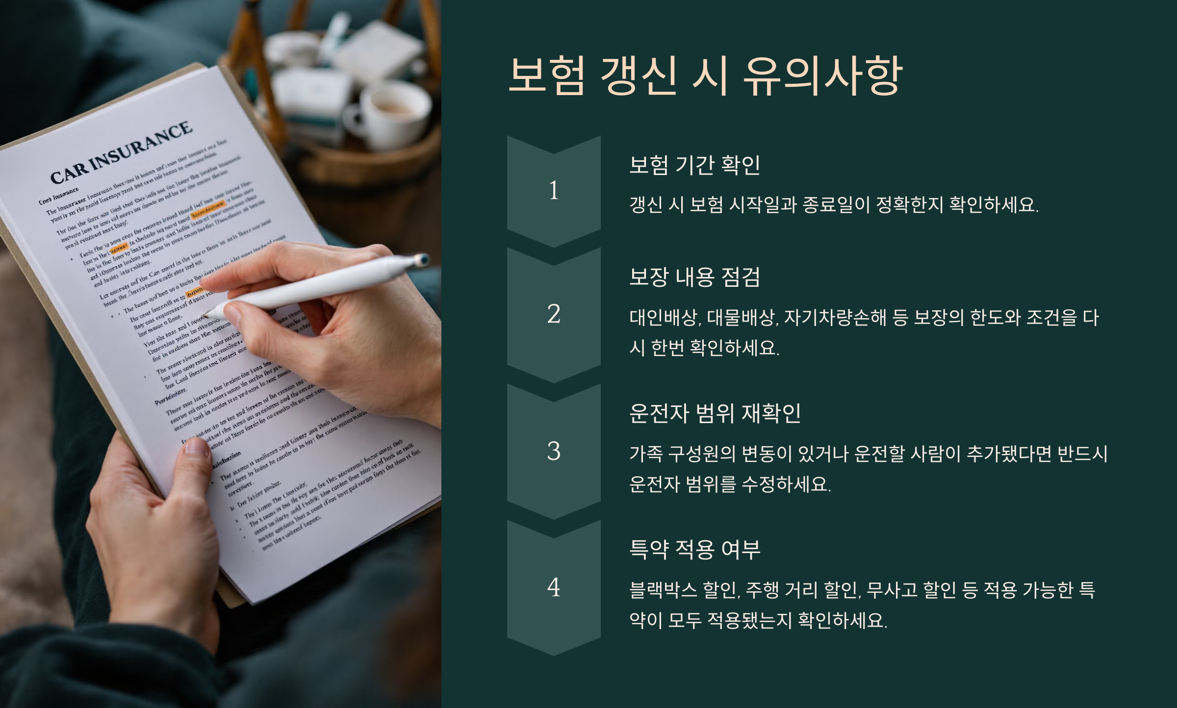 - 보험 기간: 보험 기간이 정확한지 확인하세요. 갱신 시점부터 바로 적용되어야 해요.