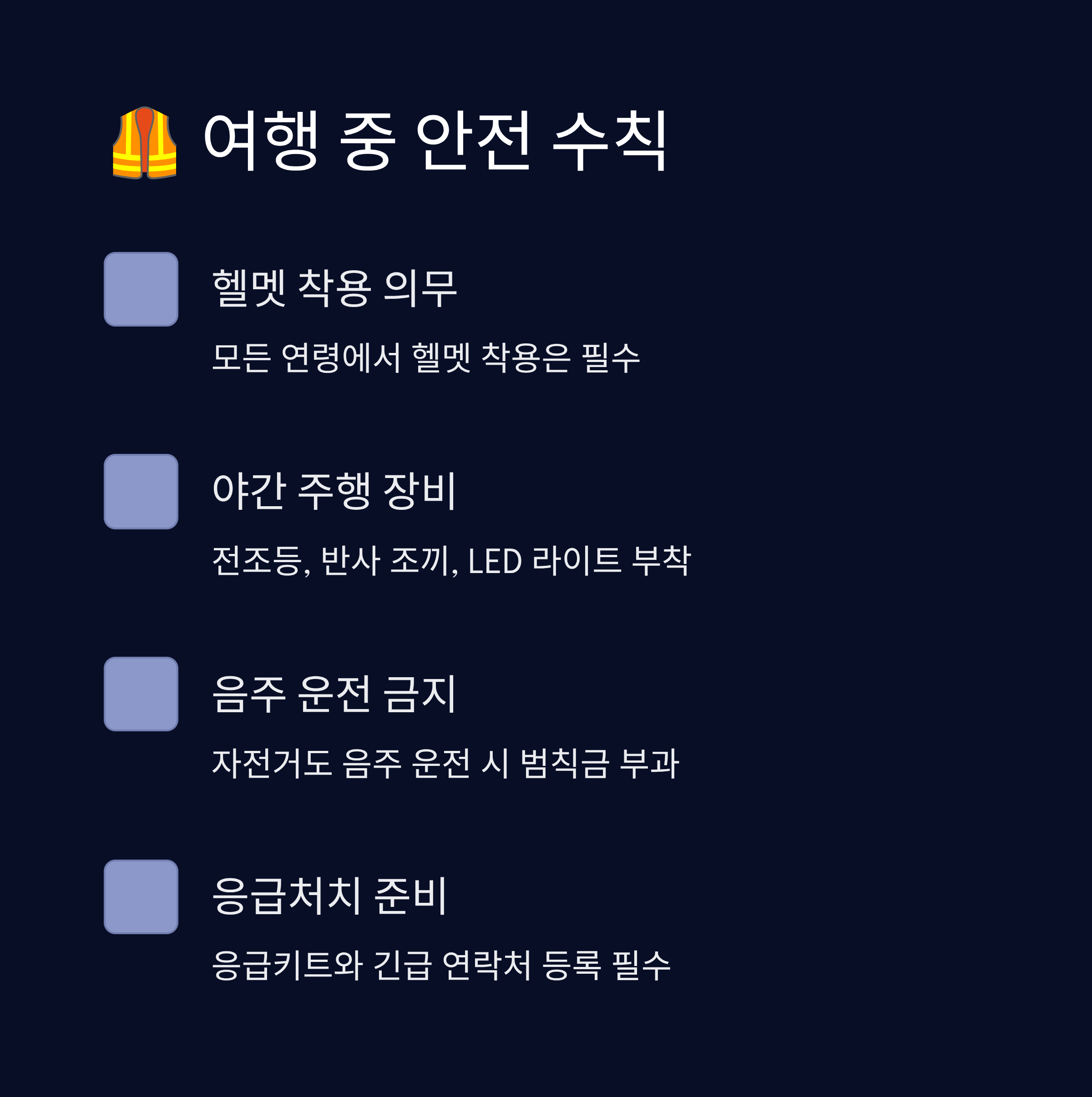 자전거 여행은 자유로운 만큼 위험 요소도 함께 존재해요. 특히 차량이 함께 다니는 국도나 지방도에서는 항상 사고 예방을 최우선으로 생각해야 해요. 안전을 지키는 가장 기본은 ‘헬멧 착용’이에요. 모든 연령에서 헬멧 착용은 의무화되어 있어요.