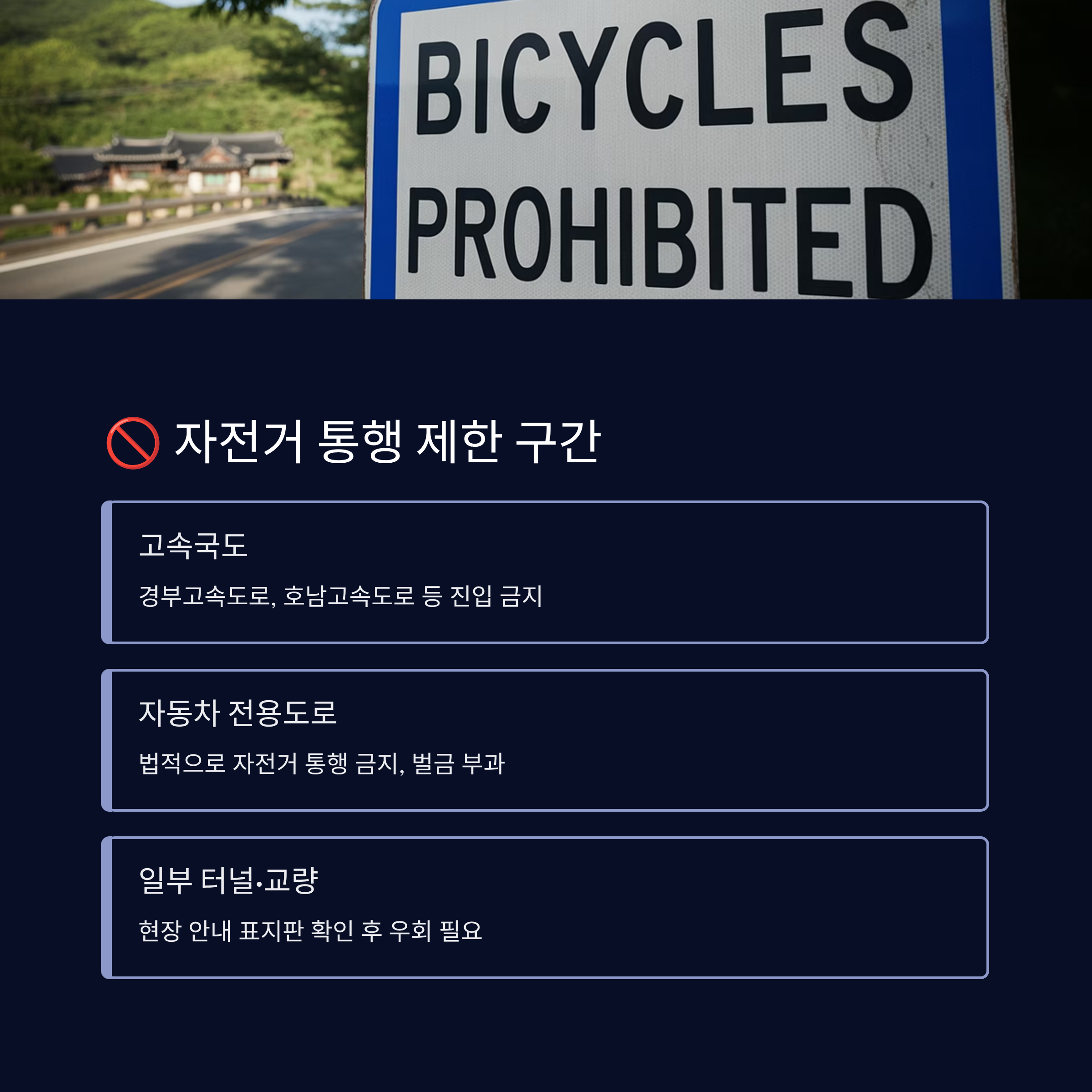 예를 들어 경부고속도로, 호남고속도로, 영동고속도로 등은 자전거가 절대 들어갈 수 없어요. 심지어 일부 지방에선 자동차 전용도로가 일반 국도를 대체하고 있는 경우가 있어서 주의가 필요해요.