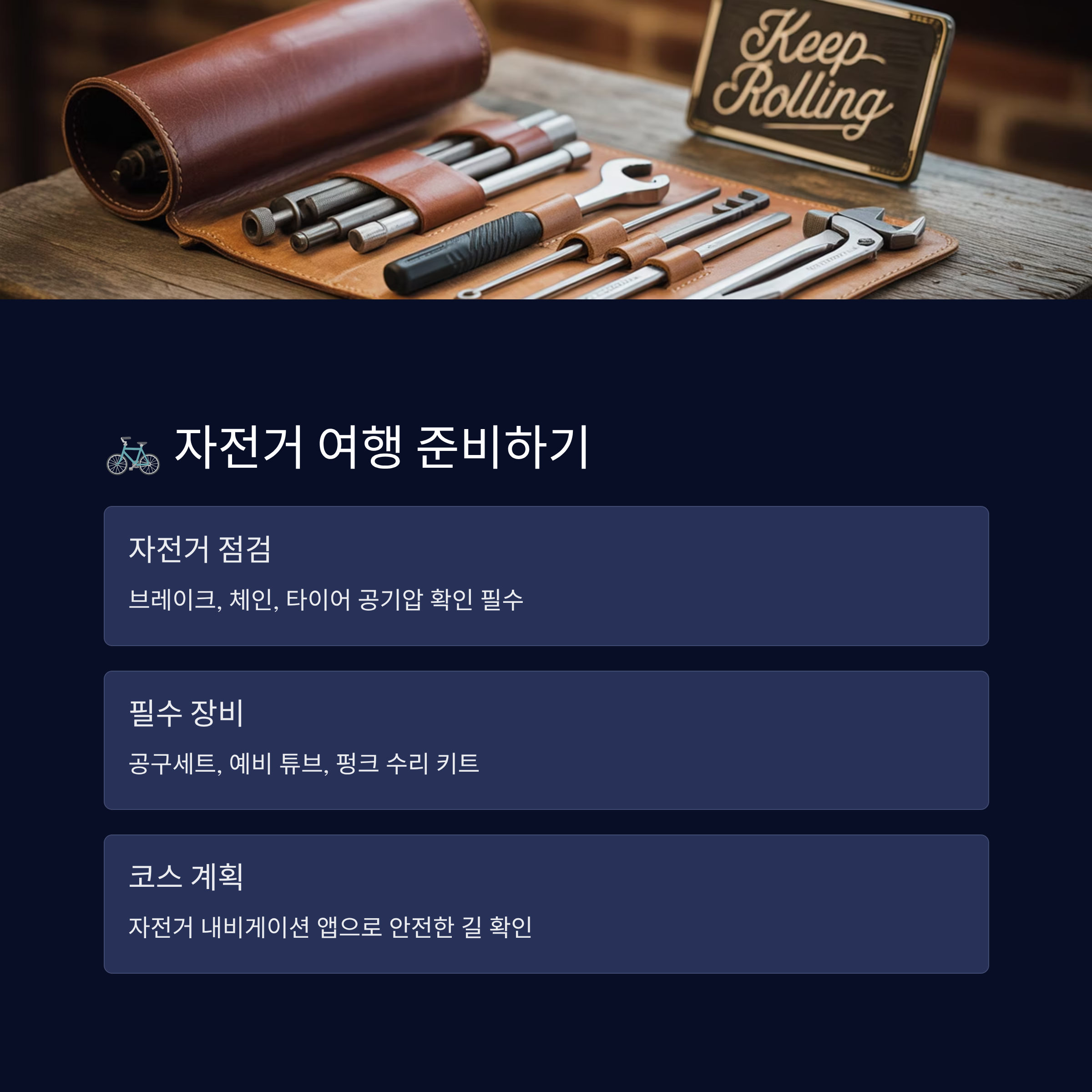 지방 여행을 준비할 땐 자전거 상태 점검이 가장 먼저예요. 브레이크, 체인, 타이어 공기압, 기어 전환 상태 등을 꼼꼼히 체크해 두는 게 좋아요. 간단한 공구세트, 예비 튜브, 펑크 수리 키트는 필수로 챙겨야 하고요.