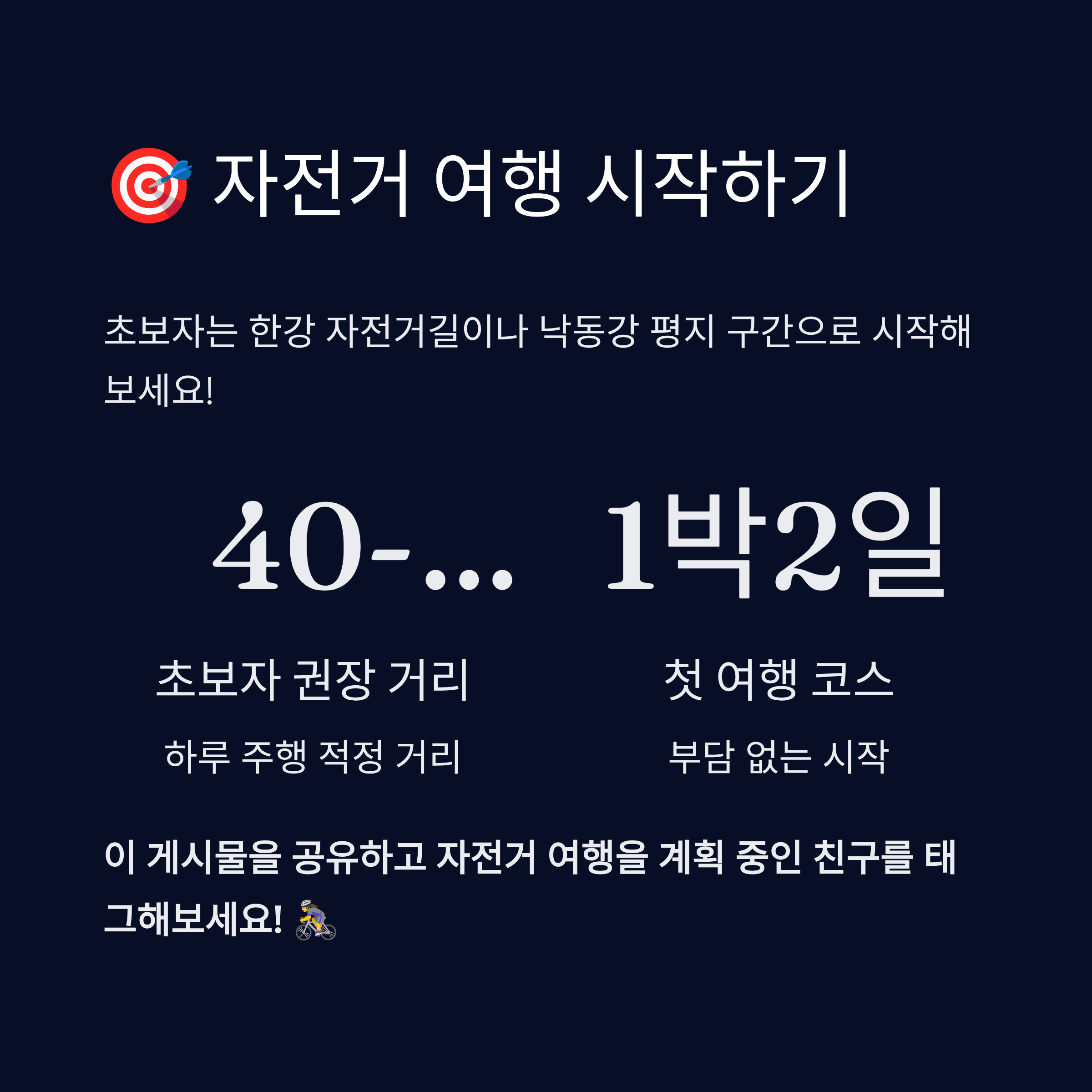 A8. 한강 자전거길, 경의선 숲길, 낙동강 일부 구간은 평지 위주로 되어 있어 초보자에게 적합해요. 1박2일 코스로 시작해보는 걸 추천해요.
