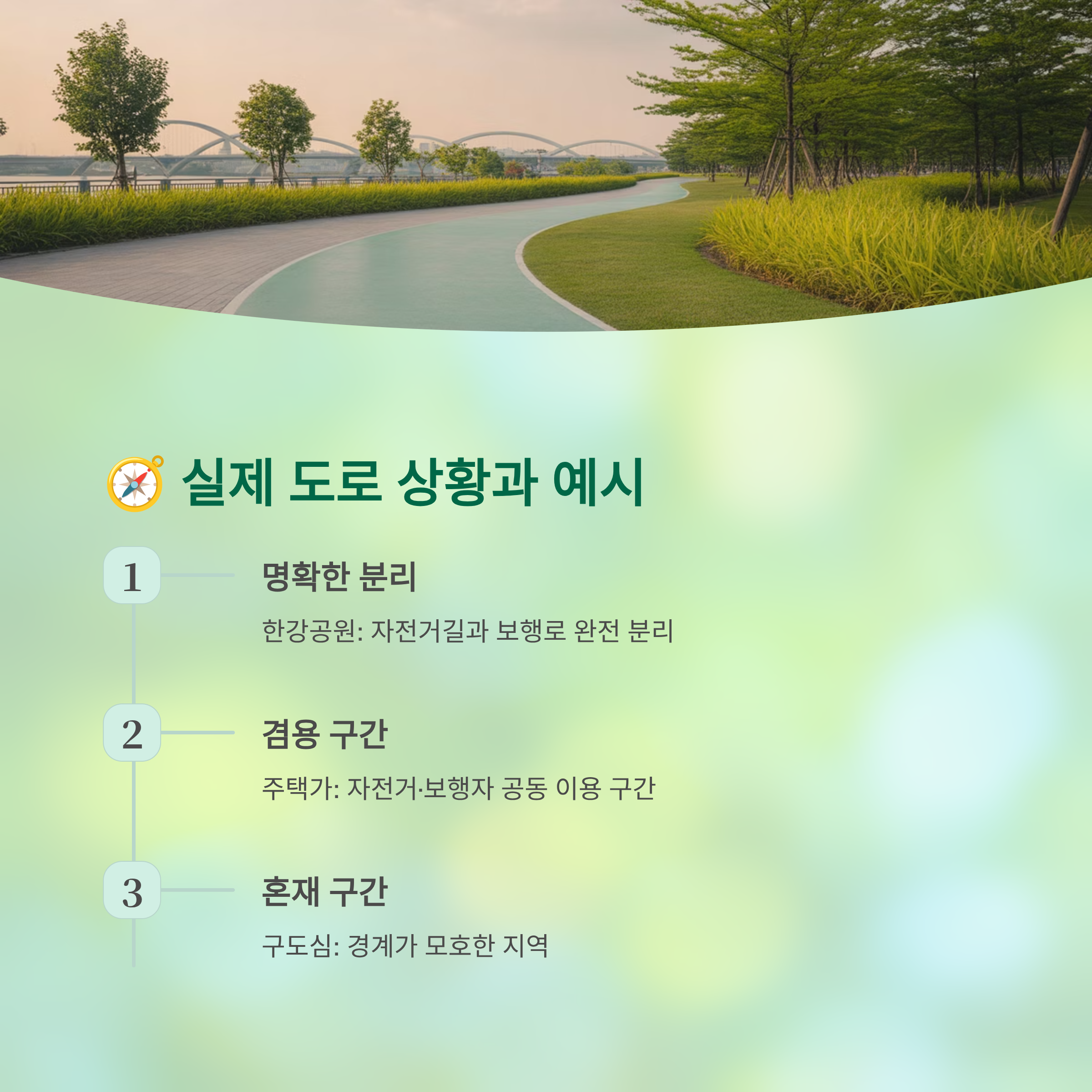 많은 사람들이 헷갈려 하는 부분이 바로 이 경계예요. ‘여긴 자전거 도로야, 저긴 인도야’ 하고 분명히 구분되었으면 좋겠지만, 현실은 그렇지 않은 경우가 너무 많아요. 특히 보행자 자전거 겸용도로에서는 그 경계가 더 모호하죠.