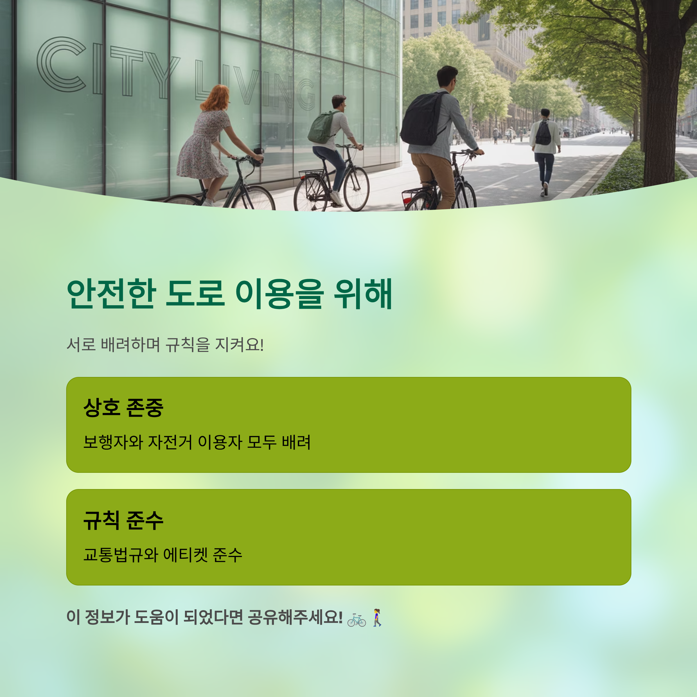 이렇게 서로의 입장에서 조금만 배려한다면, 자전거와 보행자가 함께 사용하는 공간도 충분히 안전하고 즐거울 수 있어요. 나만의 길이 아닌, 우리 모두의 길이라는 걸 잊지 말아주세요! 🙏