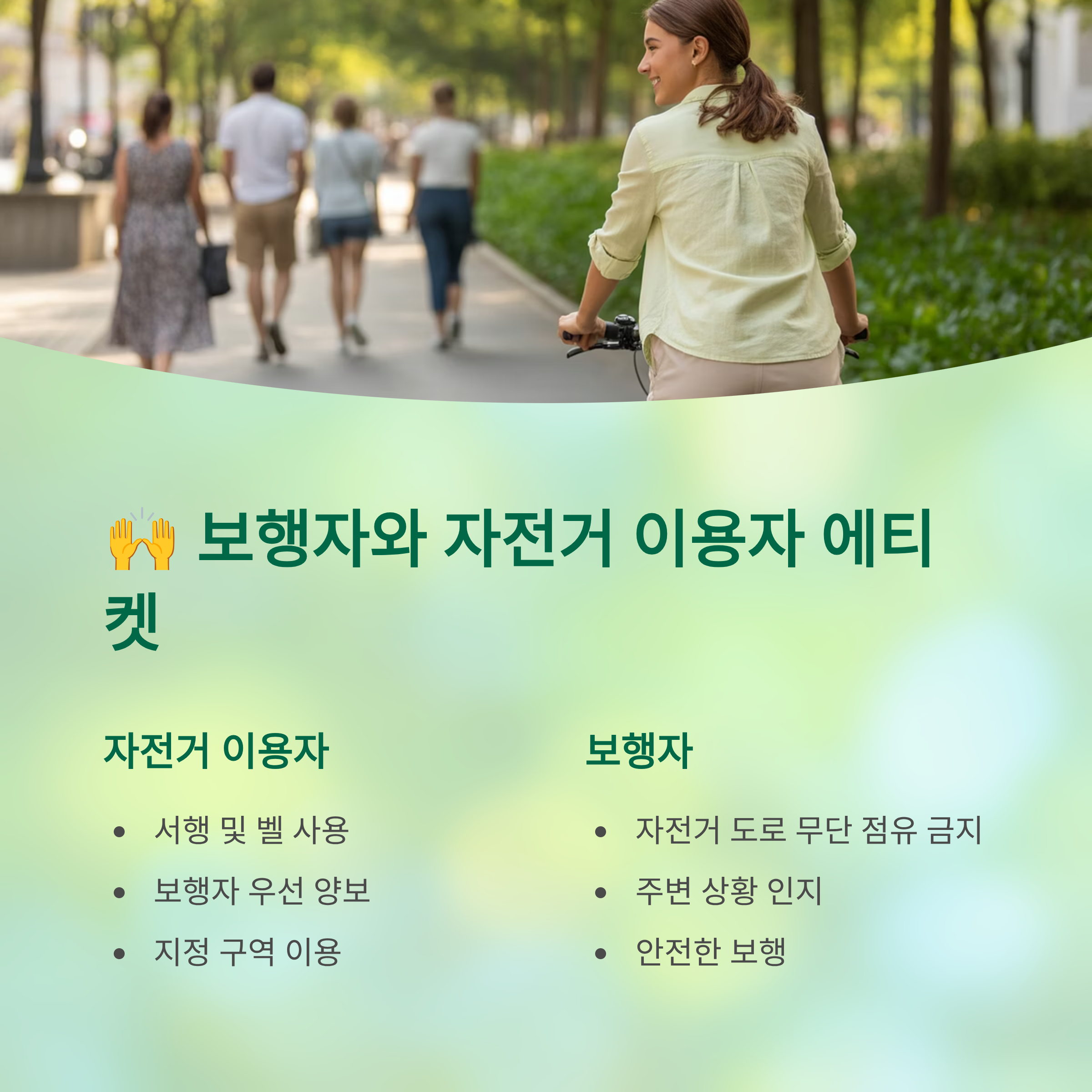 자전거 도로와 인도가 명확하게 나뉘지 않은 곳이 많기 때문에, 서로를 존중하고 배려하는 태도가 정말 중요해요. 법적인 기준도 물론 중요하지만, 결국 일상 속에서는 에티켓이 우리 모두의 안전을 지켜주는 열쇠가 되거든요 😊