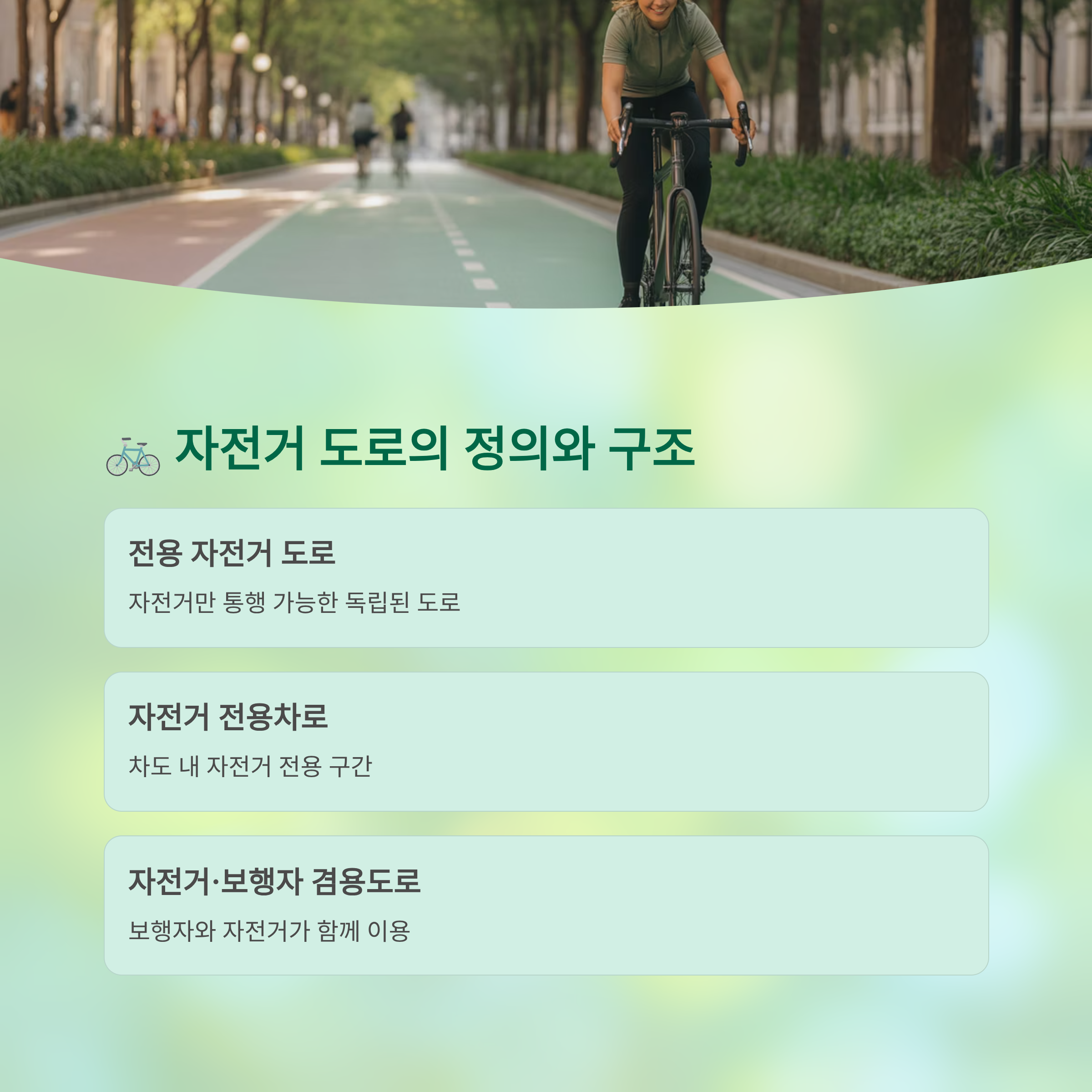 자전거 도로는 크게 3가지 유형으로 나뉘어요. 첫 번째는 ‘자전거 전용도로’, 두 번째는 ‘자전거 우선도로’, 마지막으로는 ‘보행자 자전거 겸용도로’예요. 각 유형마다 규칙과 이용법이 조금씩 다르답니다.