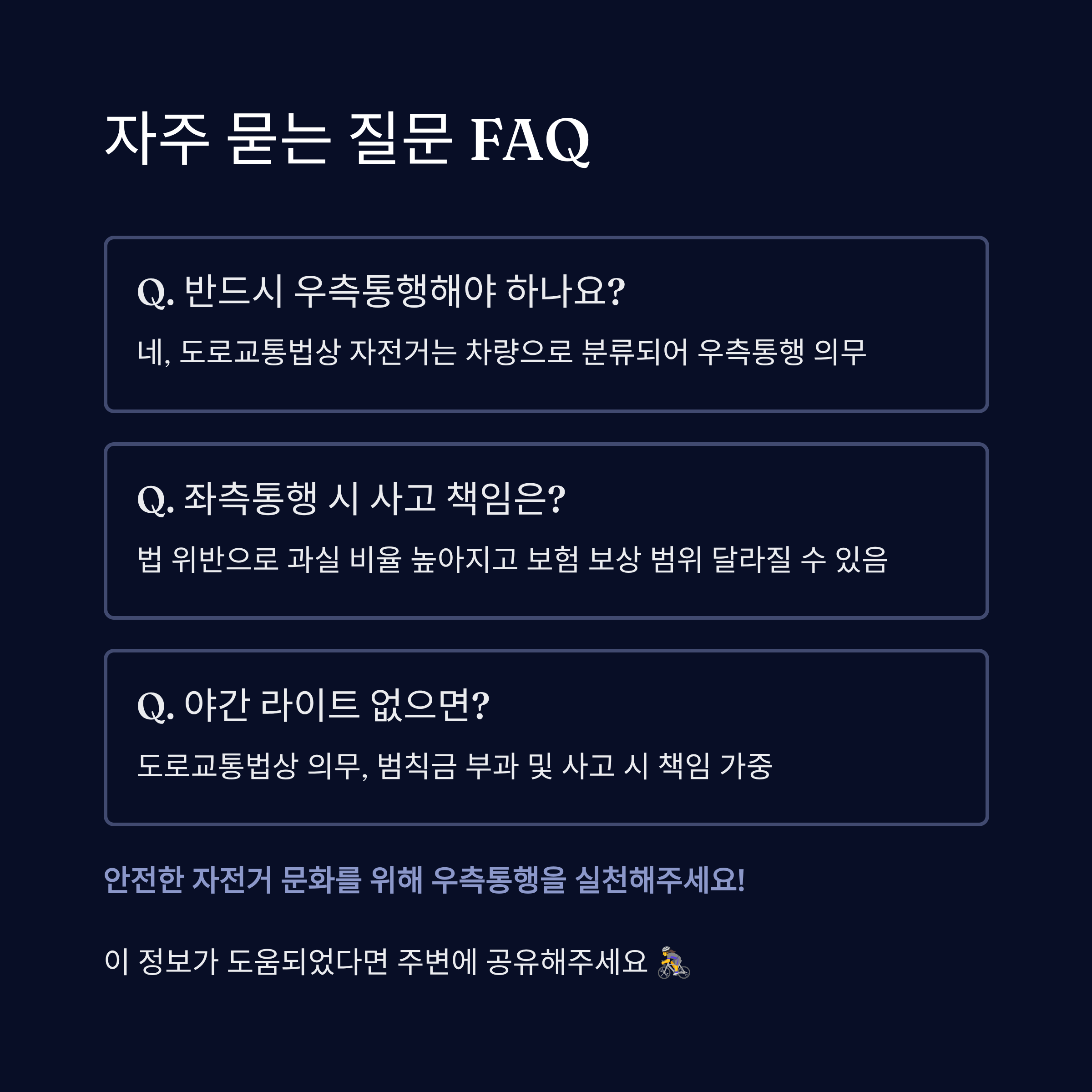 이제 자전거 통행 방향에 대해 완전히 정리되었죠? 😊 다음은 마지막 섹션인 **FAQ**예요. 많은 분들이 궁금해했던 질문 8가지를 바로 이어서 소개할게요!