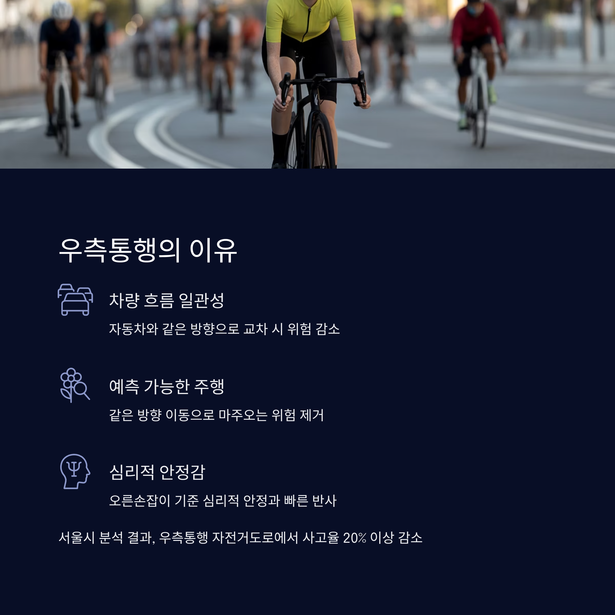 자전거는 상대적으로 속도가 느린 교통수단이에요. 그래서 갑작스런 방향 변경이나 예기치 않은 반대방향 주행은 대처가 어려워요. 우측통행을 하면 사고 가능성을 줄일 수 있어요. 실제로 서울시의 교통사고 분석 결과, 우측통행이 잘 지켜지는 자전거도로에서 사고율이 20% 이상 낮은 것으로 확인됐어요.