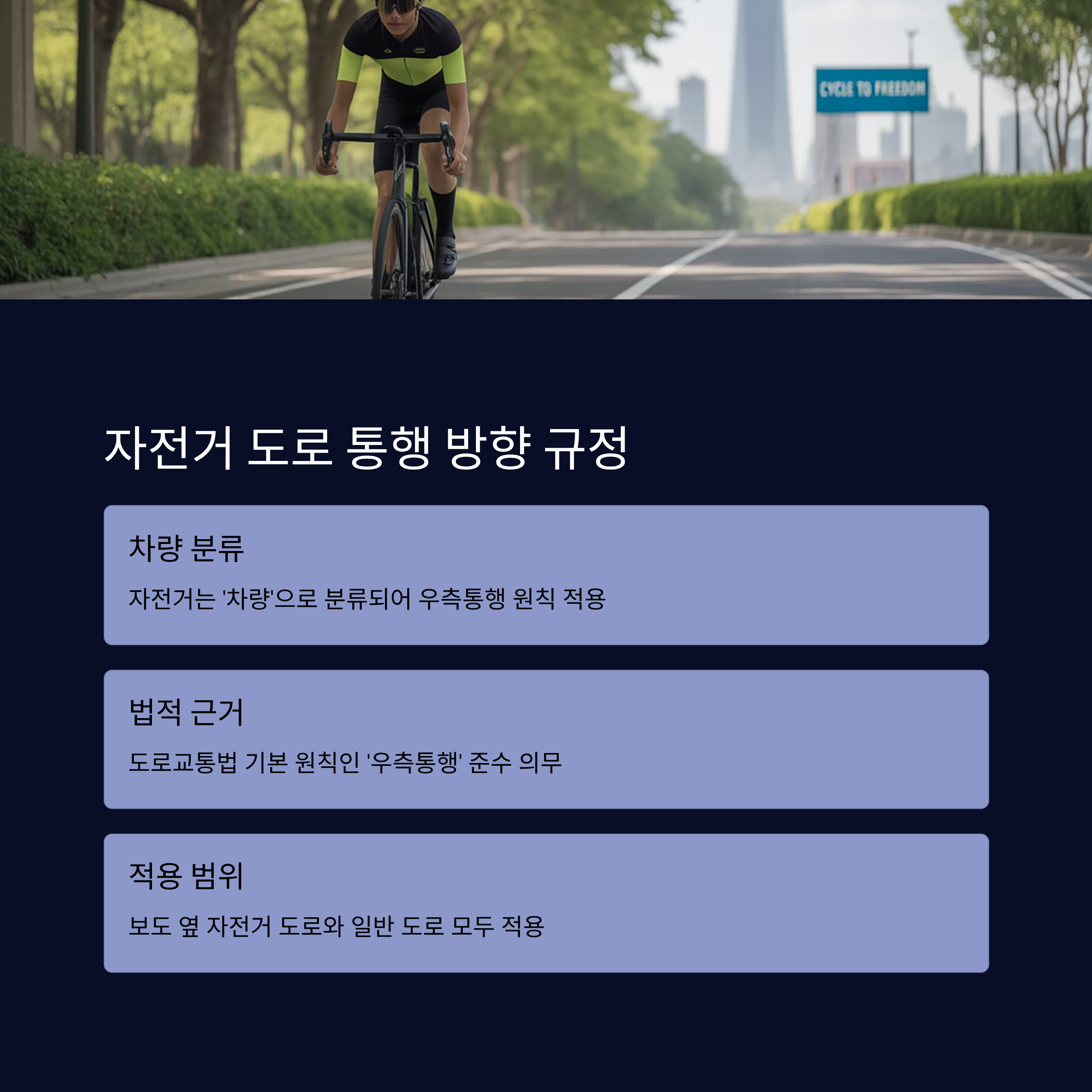 대한민국에서 자전거는 '차량'으로 분류돼요. 그래서 도로교통법의 기본 원칙인 '우측통행'을 따라야 해요. 도로 위에서 자전거를 타는 사람은 자동차처럼 우측으로 주행해야 하는 거죠. 이는 보도 옆에 설치된 자전거 도로나 일반 도로에서 모두 적용된답니다.