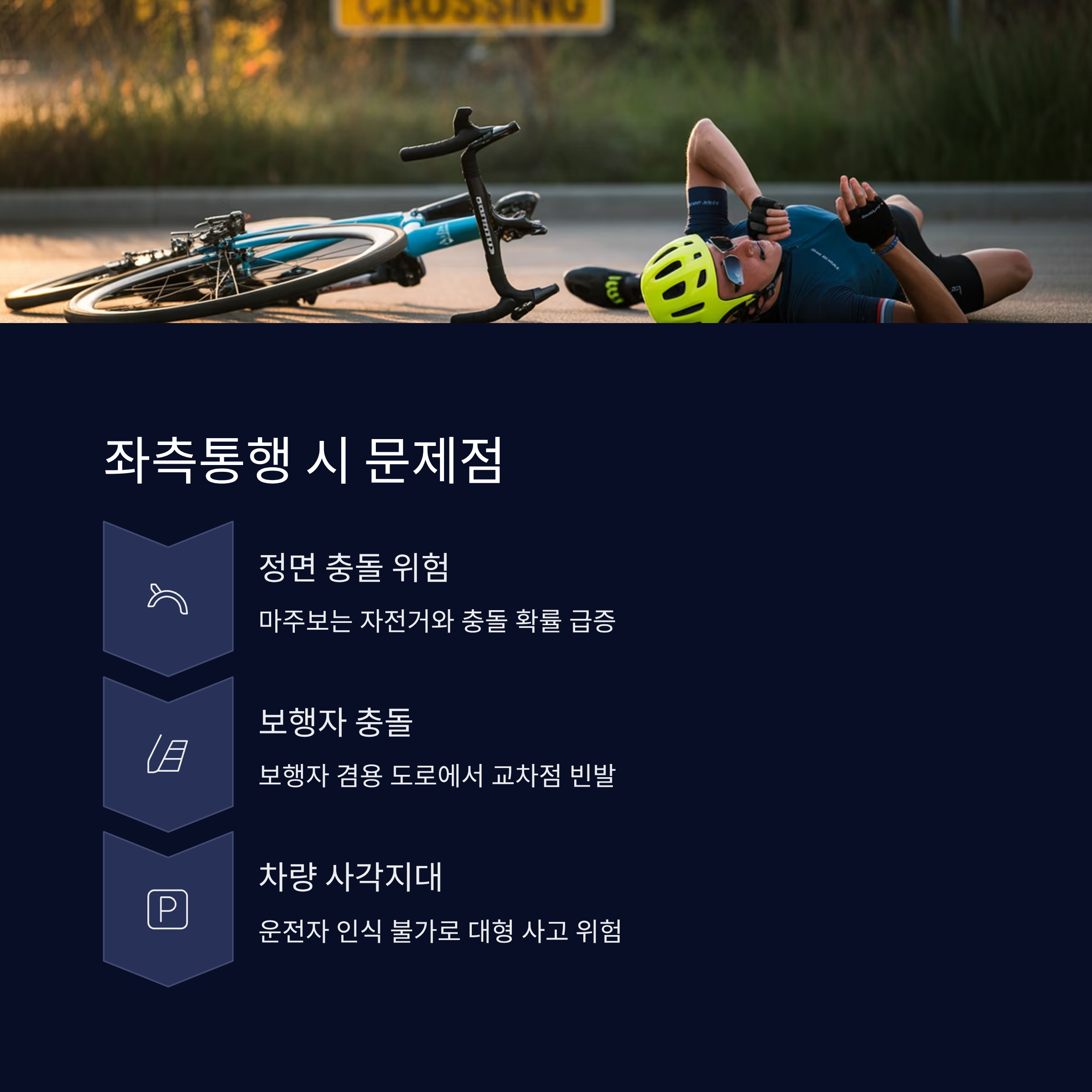 또한 차량과의 교차로에서 좌측에서 접근하면, 운전자가 해당 자전거를 인식하지 못하는 경우가 많아요. 특히 차량이 우회전하는 상황에서 좌측에서 진입하는 자전거는 사각지대에 들어가 큰 사고로 이어질 가능성이 높아요. 이는 도로교통법 위반뿐 아니라, 목숨이 걸린 문제이기도 해요.