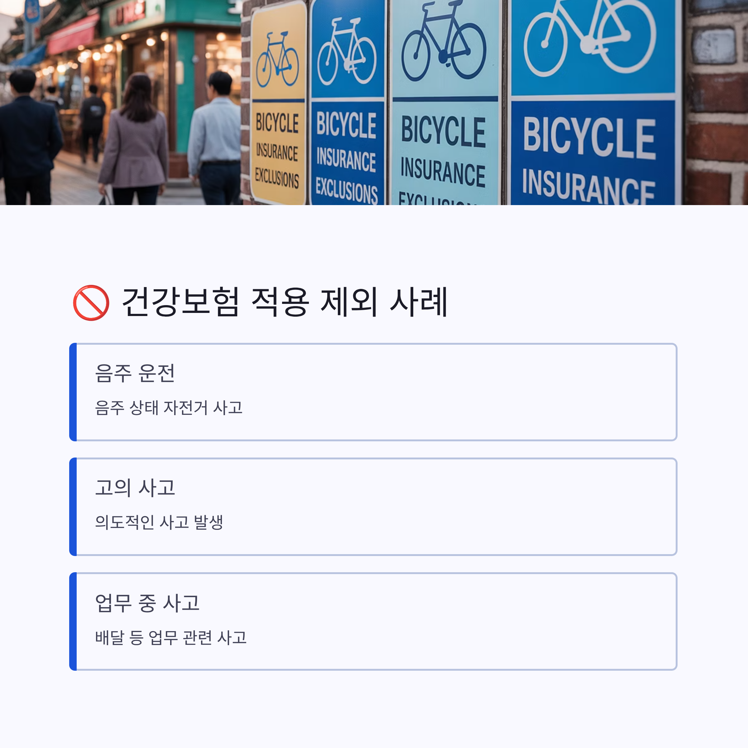 가장 대표적인 예외는 **음주 상태에서 자전거를 운전하다 사고가 난 경우**예요. 도로교통법상 자전거도 ‘차량’으로 분류되기 때문에 음주운전이 해당돼요. 만약 술을 마시고 자전거를 타다가 넘어지거나 사람과 충돌했다면, 그 사고는 고의 또는 중과실로 판단돼 건강보험 적용이 거절될 수 있어요.