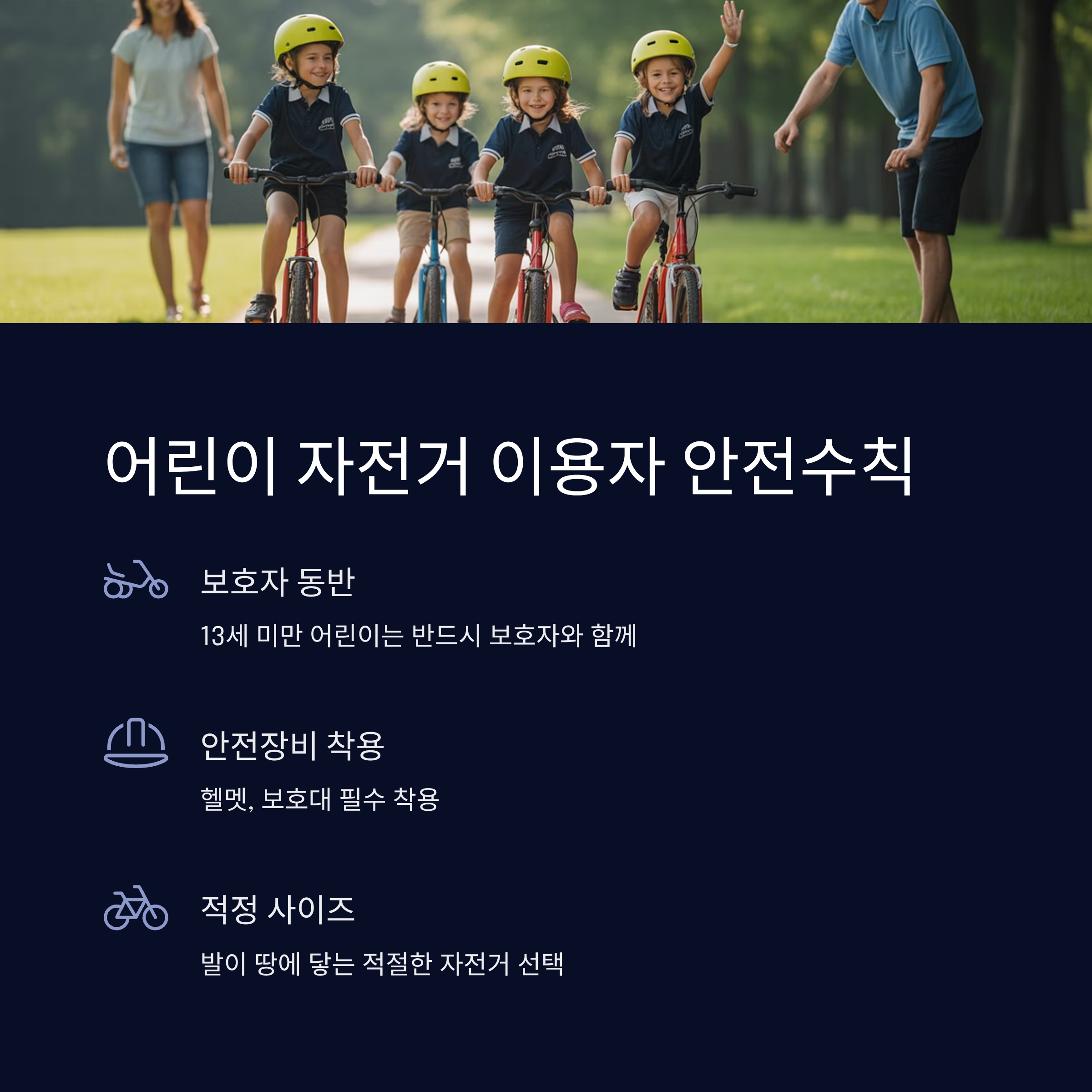 어린이 자전거 이용 시 가장 중요한 건 ‘보호자 동반’이에요. 어린이는 주변 상황에 대한 인지 능력이나 반응 속도가 부족하기 때문에 반드시 보호자가 함께 하며, 주행 방향과 속도를 조절해주는 게 좋아요.