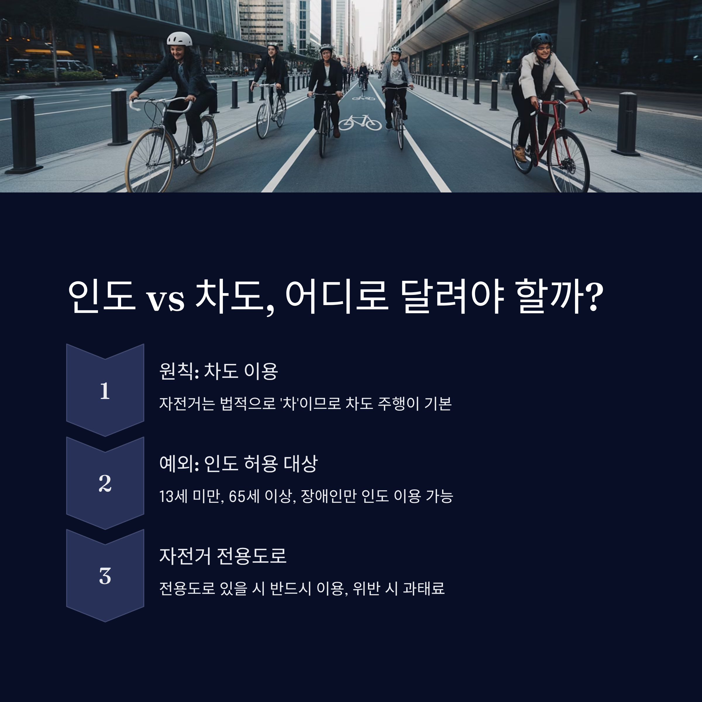 혹시 ‘자전거가 위험하니까 인도로 가는 게 낫지 않을까?’라고 생각할 수 있지만, 사실 보행자와의 충돌은 치명적인 사고로 이어질 수 있어요. 그래서 도로교통법에서도 ‘차도로 주행’을 기본으로 정하고 있는 거예요.