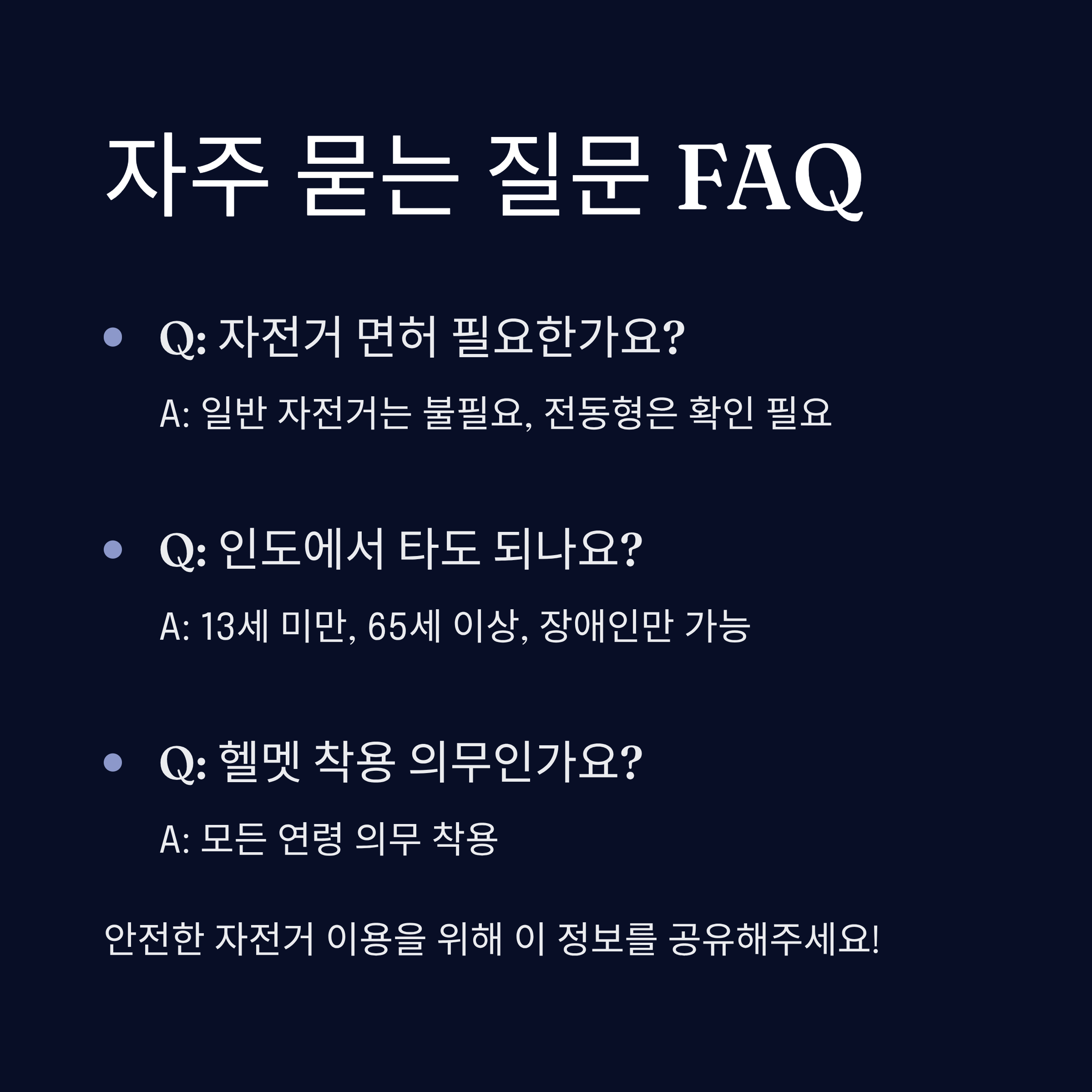 🚴‍♂️ 이처럼 자전거도 법과 안전의 틀 안에서 즐겁게 이용해야 해요. 마지막으로, 지금까지 나왔던 궁금증을 모아서 정리한 **FAQ** 섹션을 소개할게요!