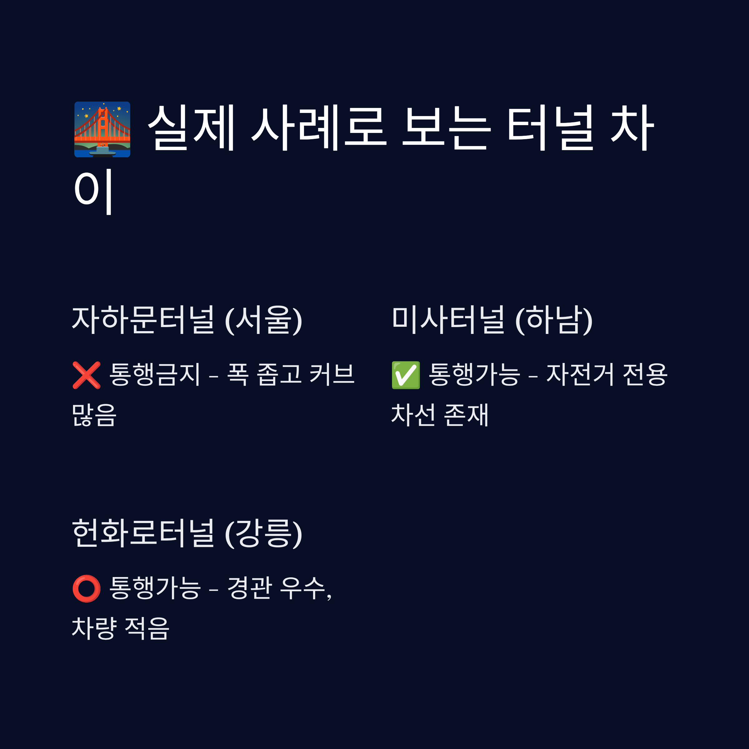 자전거 통행 가능 터널과 금지 터널의 차이를 가장 확실하게 이해하려면 실제 사례를 살펴보는 게 좋아요. 전국 곳곳에는 구조, 법적 기준, 안전 설비에 따라 자전거 통행이 허용되거나 금지된 터널들이 존재해요. 몇 가지 대표적인 예를 비교해볼게요. 🚴‍♀️