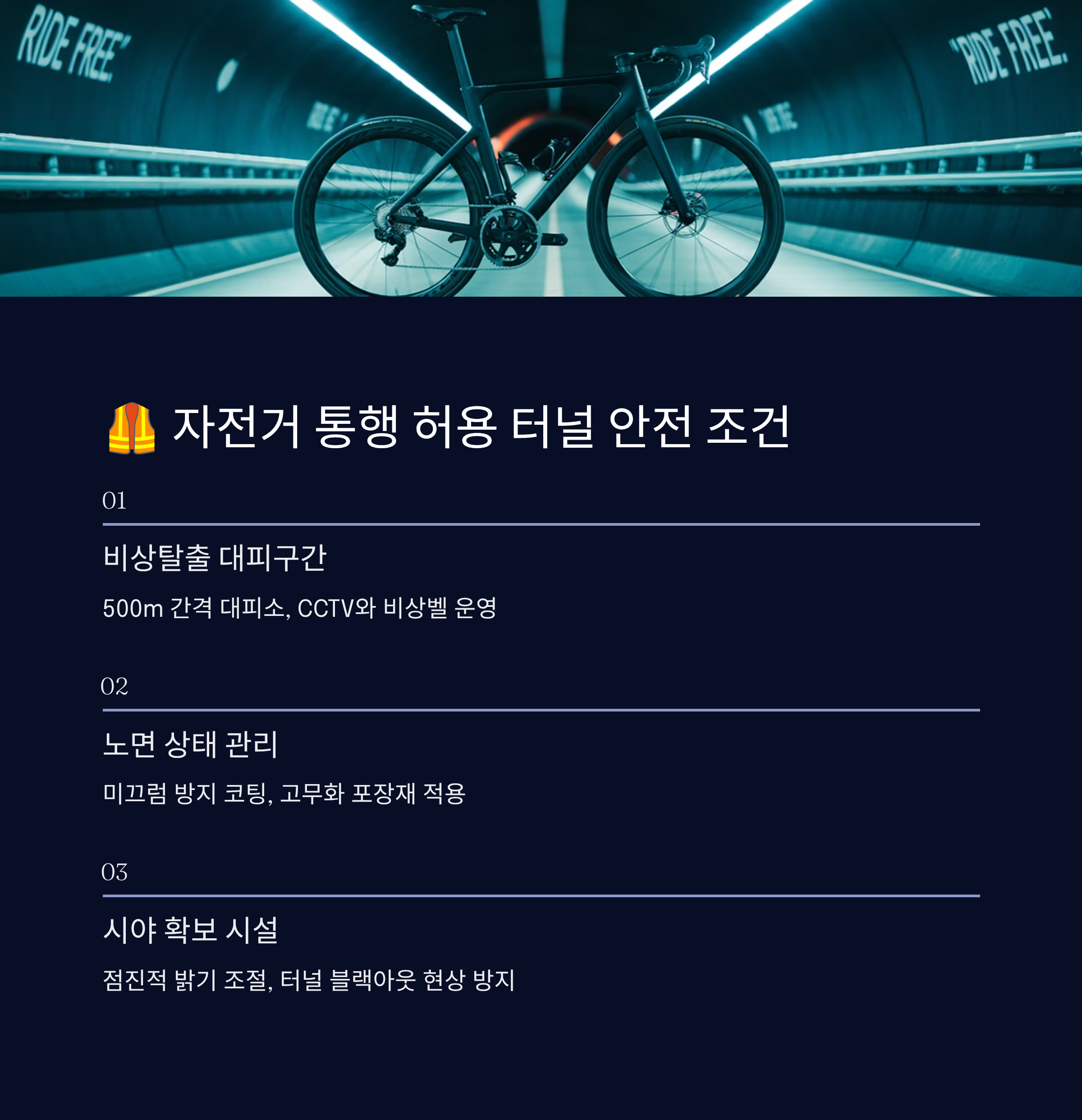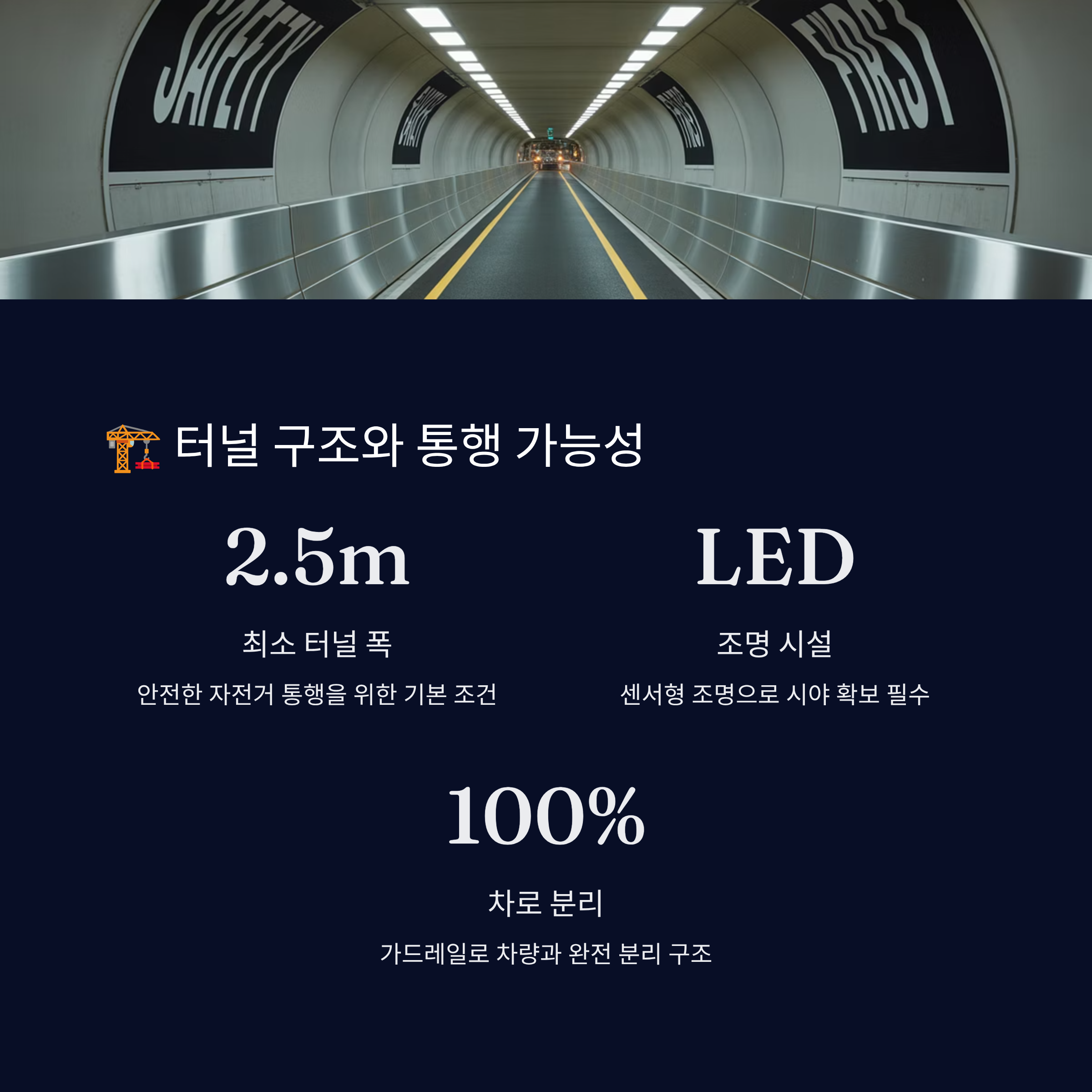 셋째는 **도로 분리 여부**예요. 차량과 자전거의 물리적 분리가 안 된 채 같은 차로를 사용하는 구조라면, 아무리 폭이 넓다 해도 자전거는 큰 위험에 노출돼요. 그래서 최근 새로 조성되는 터널은 보행자·자전거 전용 차선을 따로 마련하고, 가드레일이나 방호벽으로 차량과 분리하는 구조가 많아요.