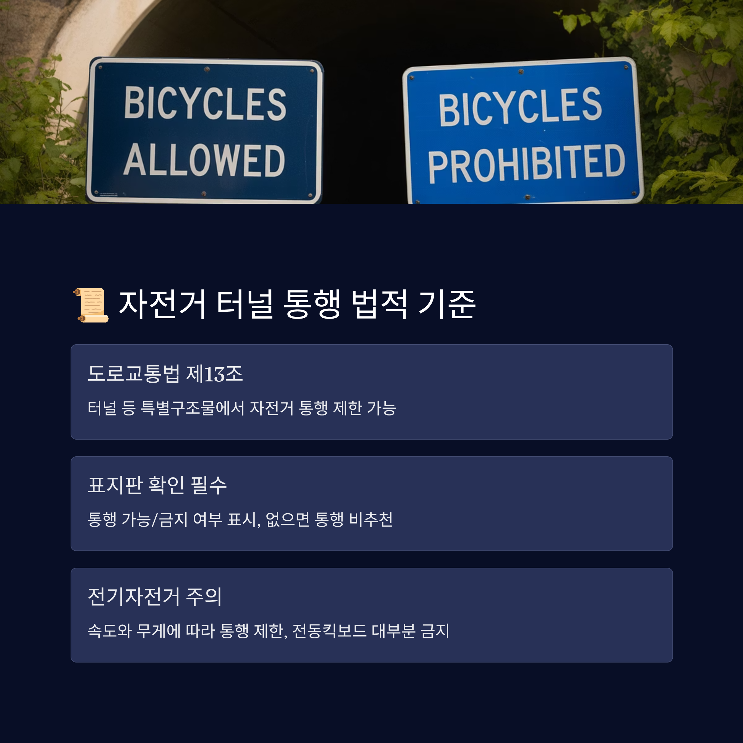 현행 법령에서는 안전을 최우선으로 하기 때문에, '통행 가능 터널'이라 하더라도 야간 조명, 시야 확보, 폭 등 물리적 요건을 충족하지 못하면 해당 지자체가 임의로 자전거 진입을 금지할 수 있어요. 그래서 실제 현장에서는 도로 표지 외에도 경찰서나 시청 교통과에 사전 확인하는 게 가장 확실한 방법이에요. ⚖️
