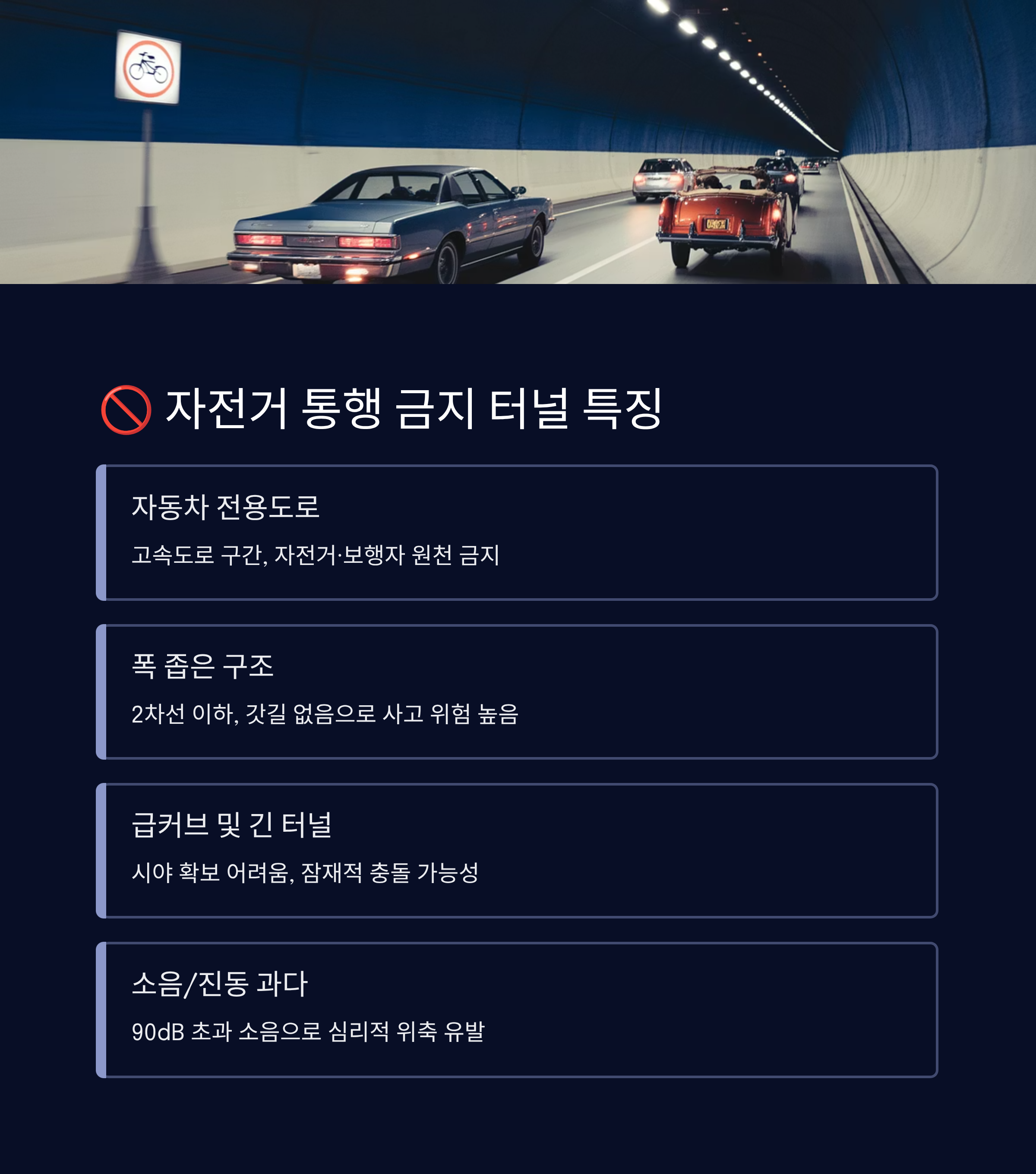 또 하나는 **사고 위험이 높은 구조**를 가진 터널이에요. 예를 들어, 편도 2차선 이하의 좁은 차로, 굴곡이 심하거나 커브가 많은 구조, 시야 확보가 어려운 곡선형 터널 등이 이에 해당돼요. 이러한 곳은 차량이 자전거를 인지하기 어렵기 때문에 '잠재적 충돌 가능성'이 매우 높아요. 특히 밤 시간대엔 그 위험이 더 커지죠. 🌒