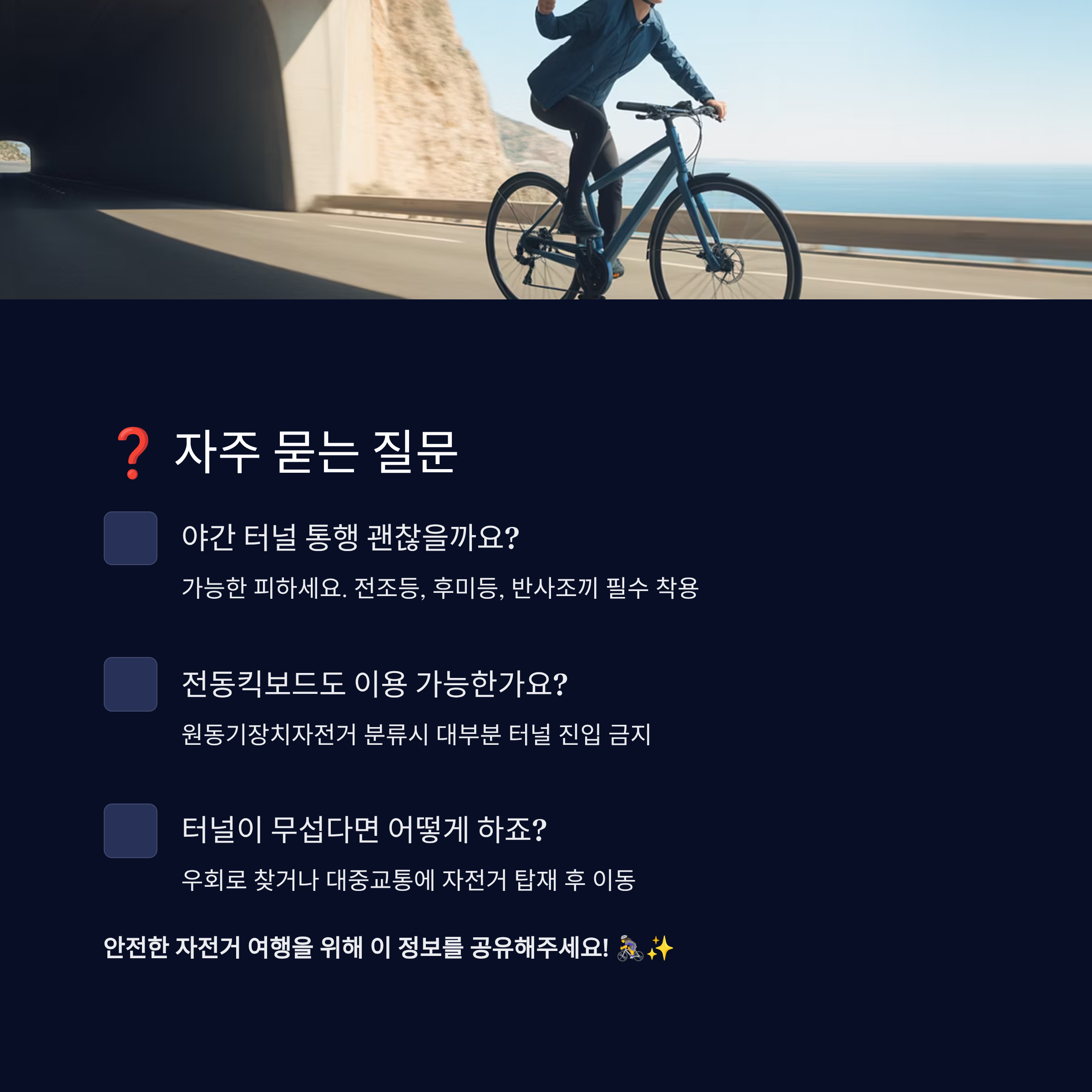 A1. 표지판에 ‘자전거 통행 가능’이라고 표시된 터널은 안전 조건이 충족되었다면 이용할 수 있어요. 단, 통행 금지 표지가 있거나 자동차 전용도로 구간은 절대 진입하면 안 돼요. 🚫