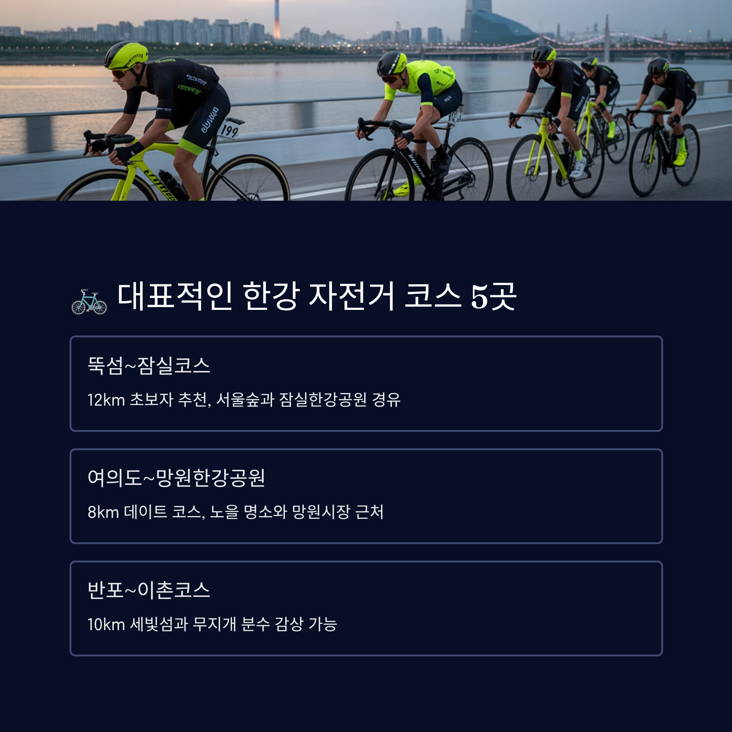 1️⃣ **뚝섬~잠실코스**: 강변북로를 따라 이어지는 구간으로 도심 속 한강의 풍경을 한눈에 담을 수 있어요. 거리는 약 12km 정도이며 평지로 구성되어 있어 초보자에게 추천돼요. 중간에 서울숲과 잠실한강공원을 지나기 때문에 경치가 정말 좋아요.