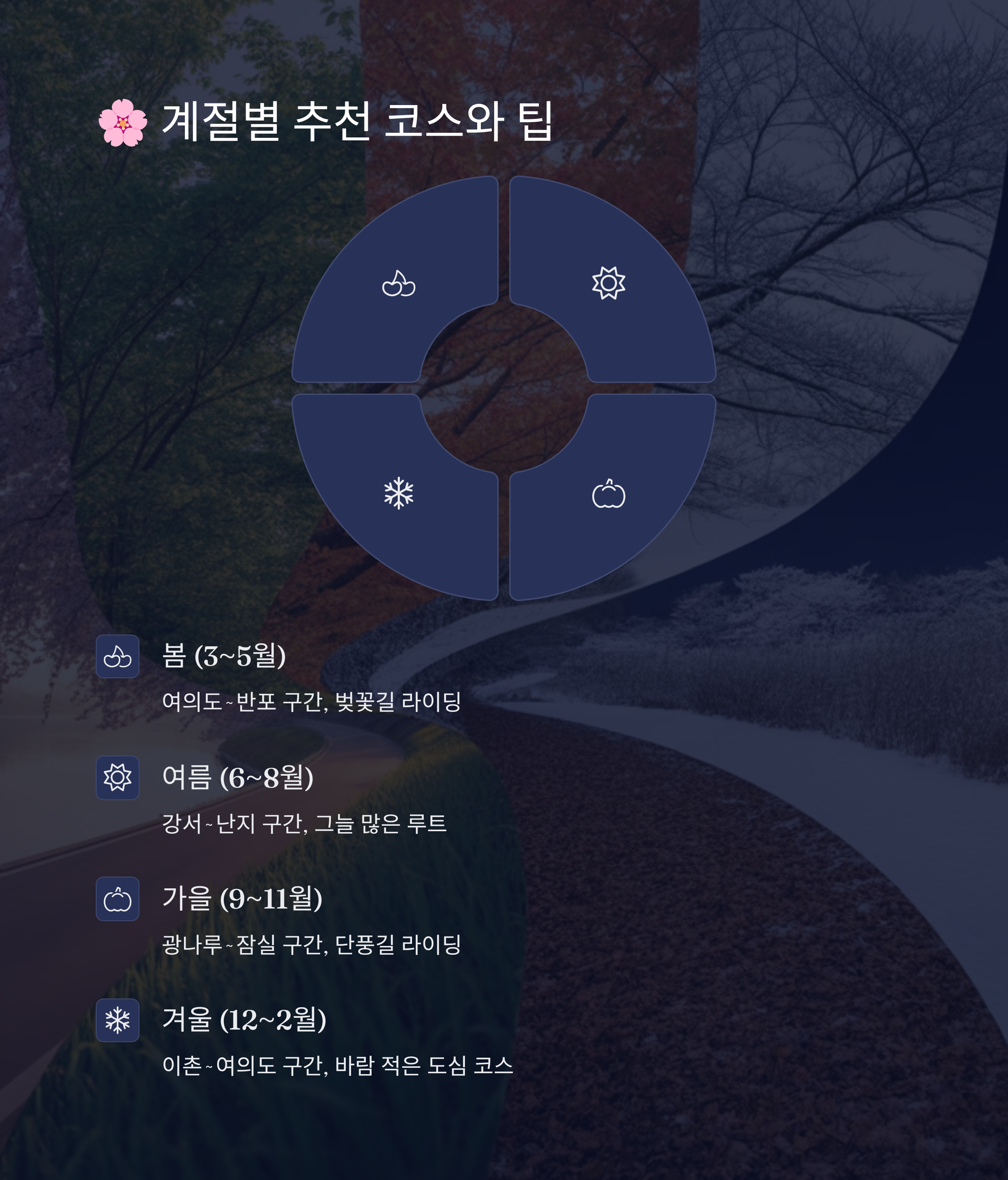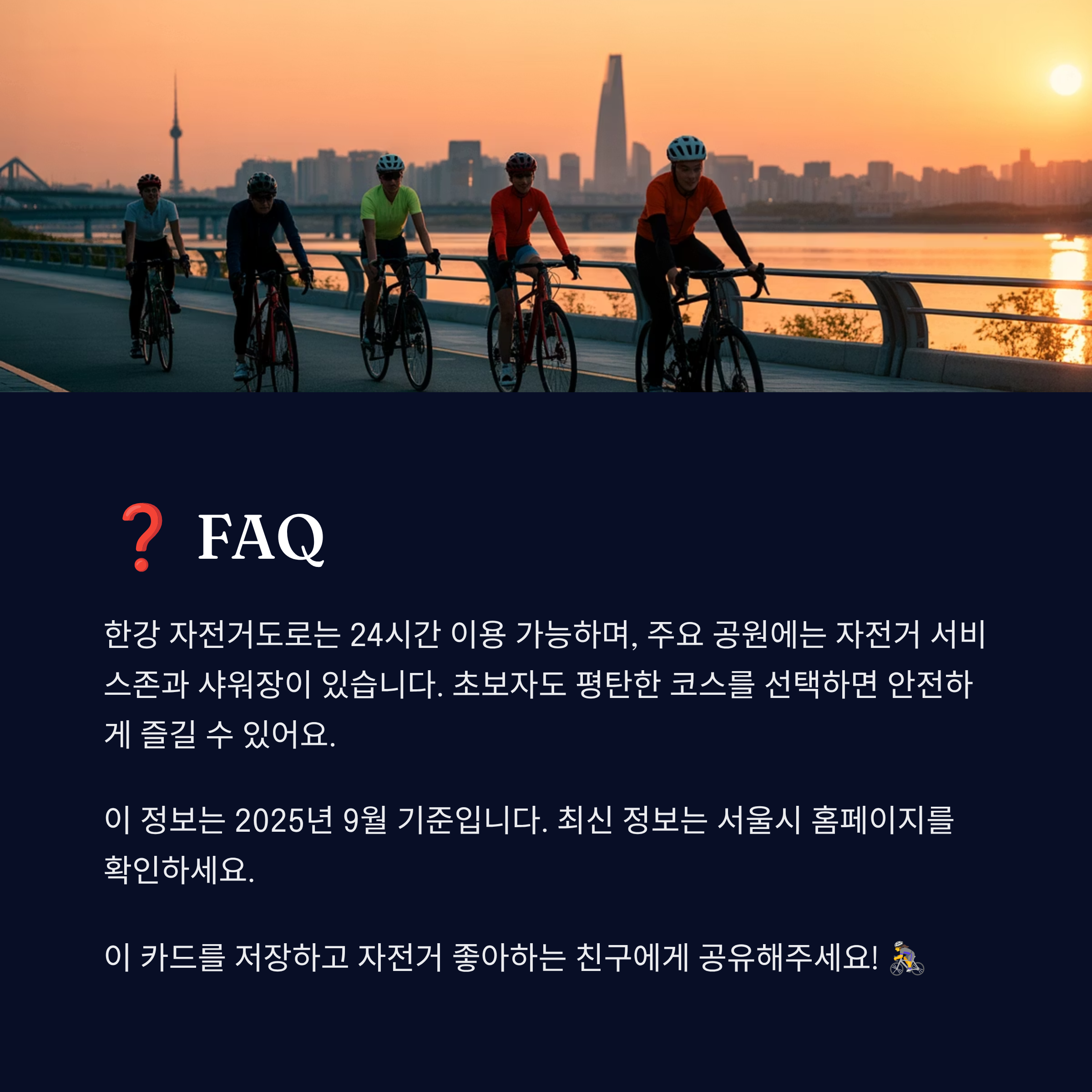 자전거를 타는 계절은 정해져 있지 않지만, 준비만 잘하면 언제든지 한강은 최고의 코스가 되어줘요! 사계절 모두 다른 매력을 주는 서울의 자전거길, 꼭 직접 경험해보길 추천해요 😊