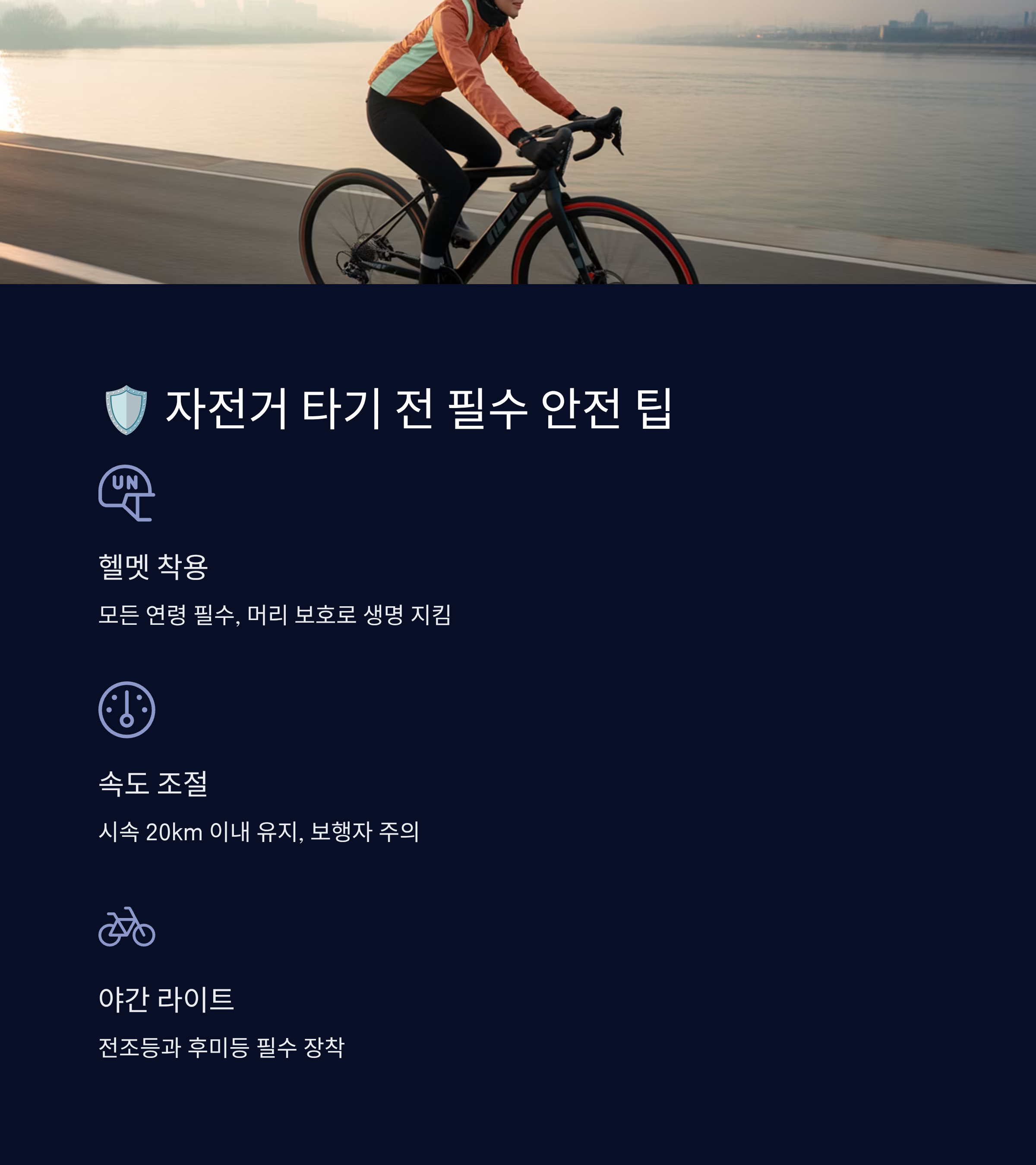 📍 다음으로는 자전거 타기 전 꼭 알아둬야 할 '안전 수칙'들을 알아볼 거예요! 🚨
