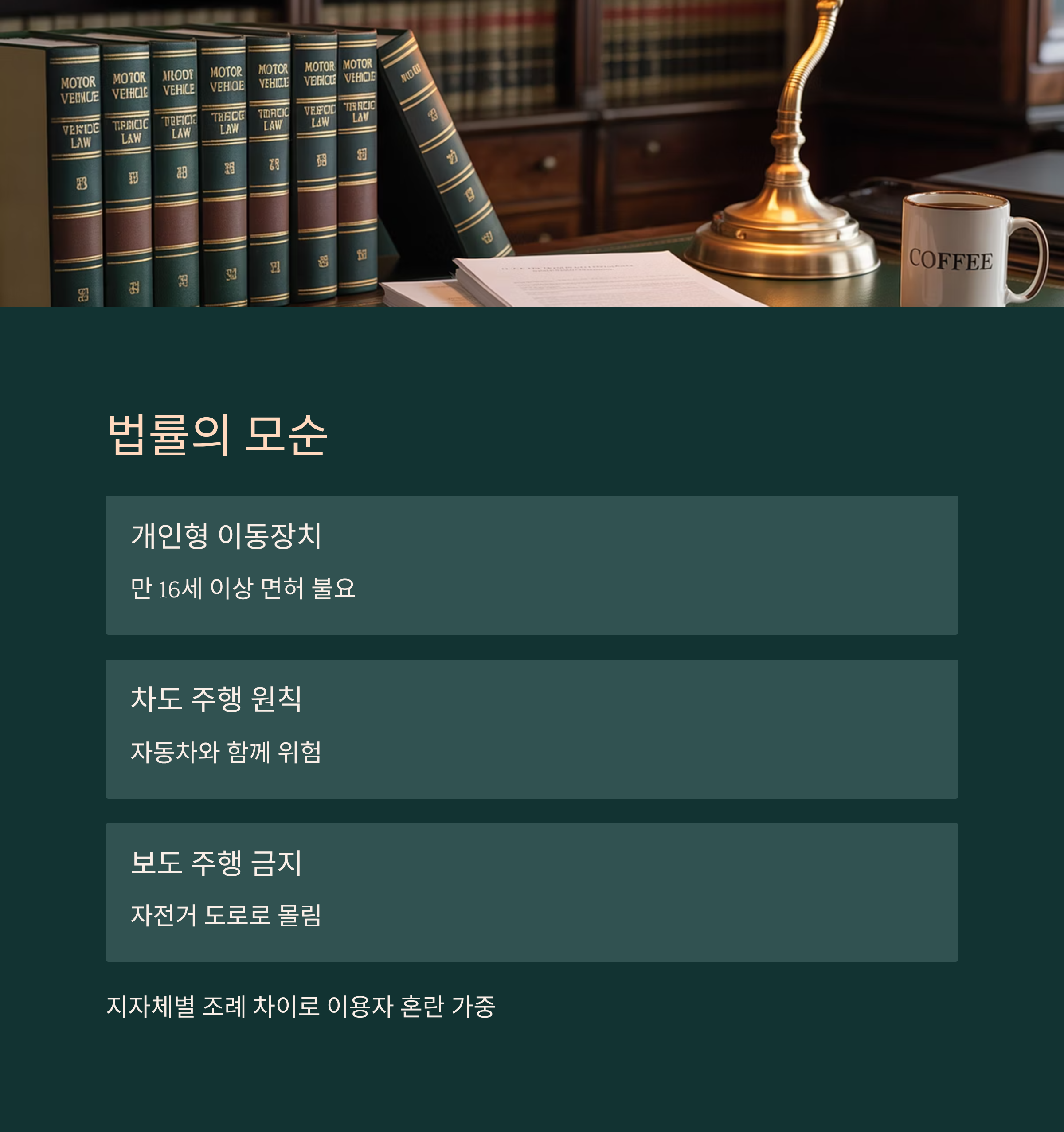 전동킥보드는 현재 법적으로 ‘개인형 이동장치’로 분류돼요. 2021년 「도로교통법」 개정 이후, 만 16세 이상이면 면허 없이도 킥보드를 탈 수 있게 됐죠. 하지만 그 이면엔 여러 모순이 숨어 있어요. 예를 들어, 차도에서는 자동차와 함께 달려야 하고, 보도는 원칙적으로 주행 금지에요. 그러다 보니 자전거 도로로 몰릴 수밖에 없게 되는 거예요.