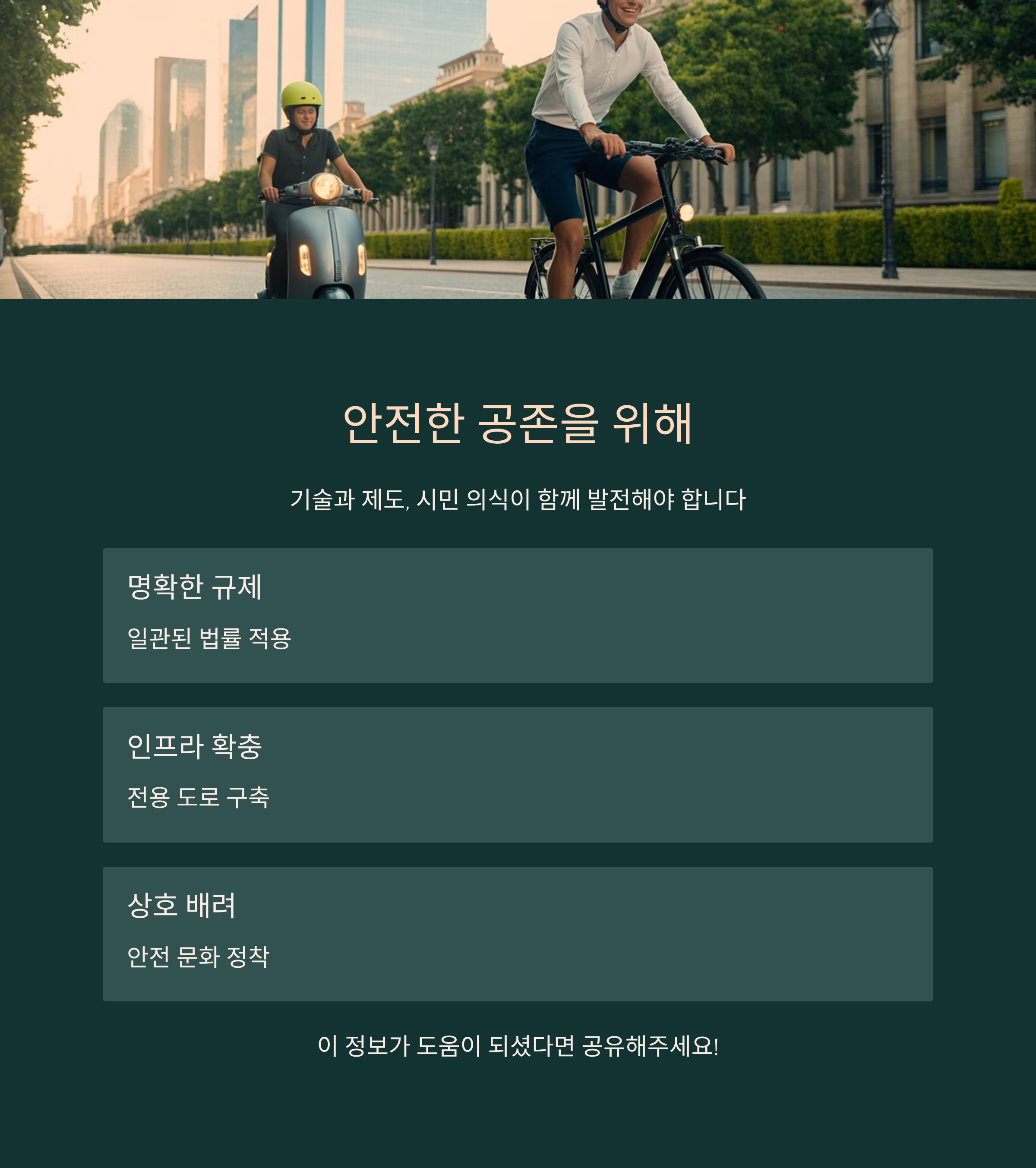 이용자 대부분은 공통적으로 “안전하게 타고 싶은데, 탈 곳이 없다”고 호소해요. 이처럼 문제는 특정 교통수단의 문제가 아니라, 도시 설계와 인식 구조 전반에 있는 셈이에요. 모두가 피해자가 될 수 있는 상황이란 말이죠.