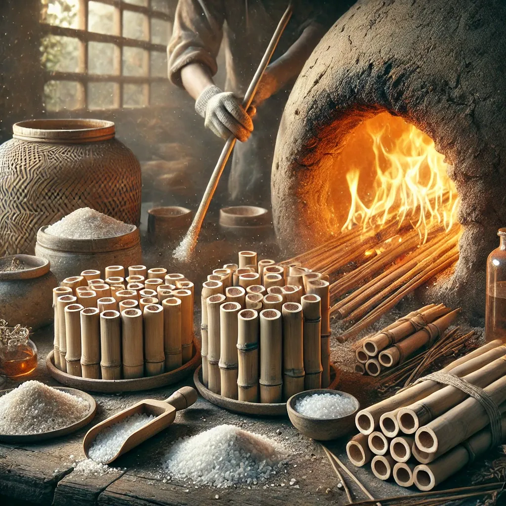 • 가마 또는 오븐에서 굽기: 대나무를 장작 가마나 고온 오븐에 넣고 약 800~900도에서 굽습니다.
