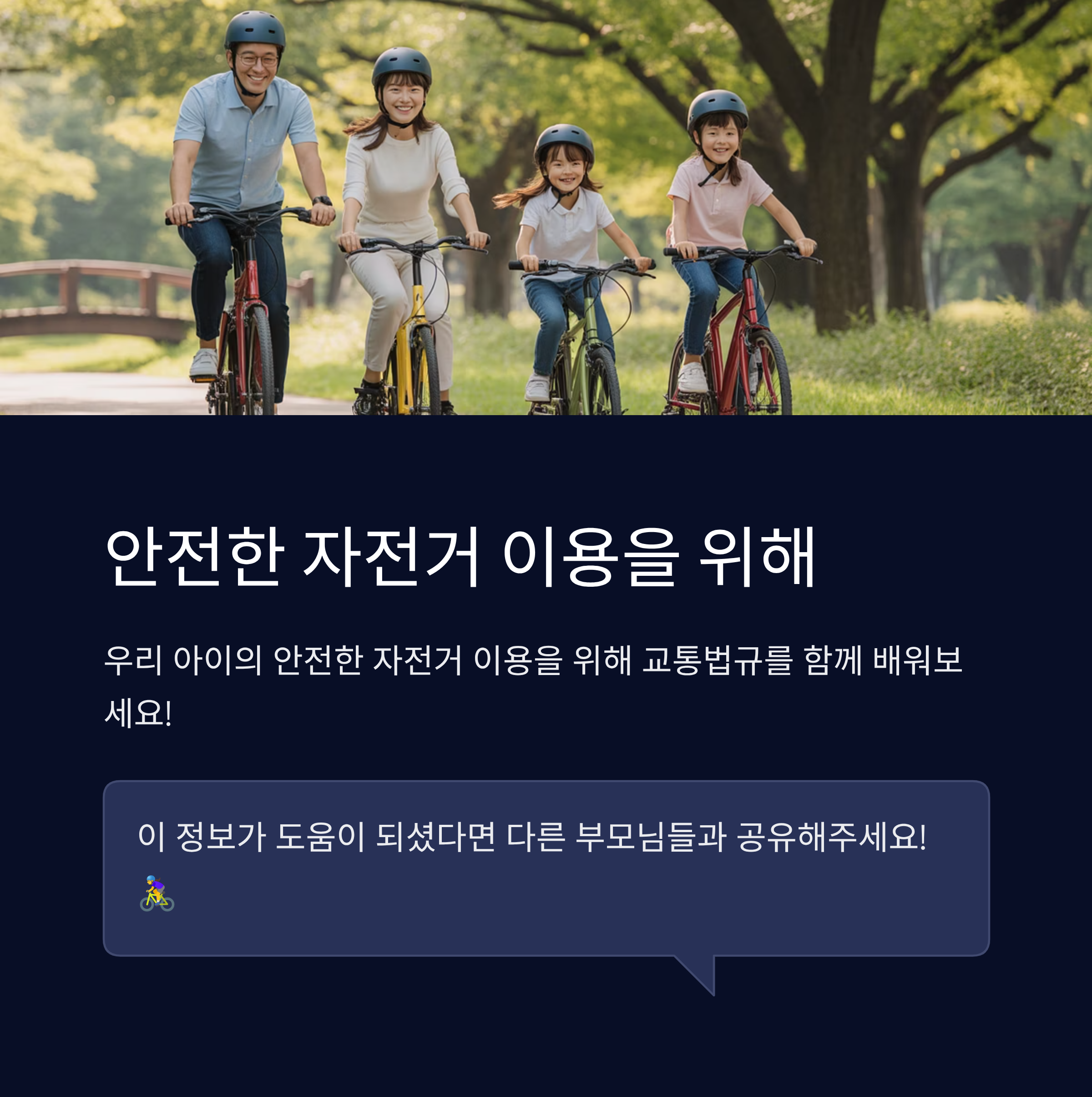 따라서 벌금은 아니지만, 부모가 책임질 일은 생길 수 있다는 걸 꼭 인지하고 자녀가 규칙을 지킬 수 있도록 평소에 잘 교육해야 해요. 자전거는 자유롭고 재밌는 이동수단이지만, 동시에 ‘도로 위의 차량’이라는 사실을 기억해야 해요.