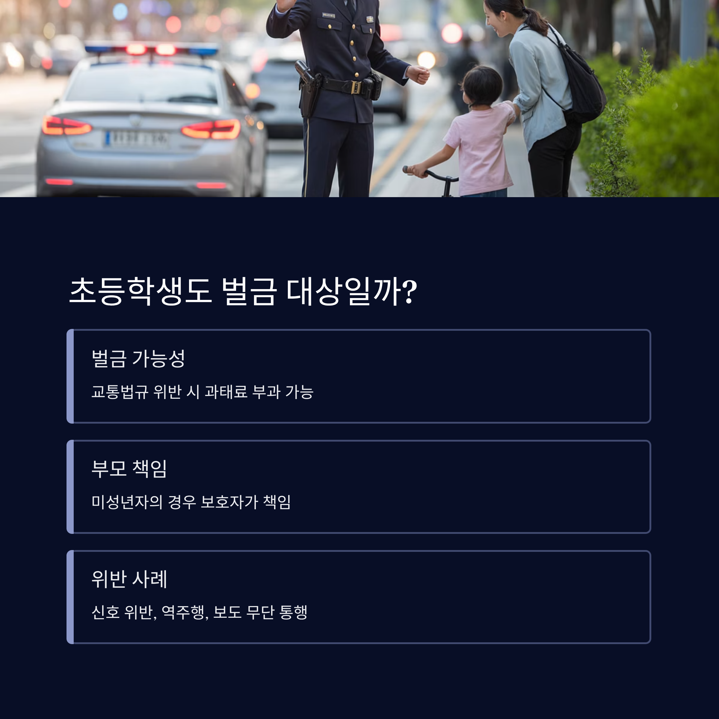 가장 많이 궁금해하는 부분이 바로 ‘아이도 벌금을 낼 수 있나요?’라는 질문이에요. 결론부터 말하면, **초등학생은 형사미성년자**에 해당해서 벌금을 부과받지 않아요. 도로교통법을 어겨도 과태료나 범칙금이 직접적으로 부과되지 않지만, 이게 면죄부는 아니에요.