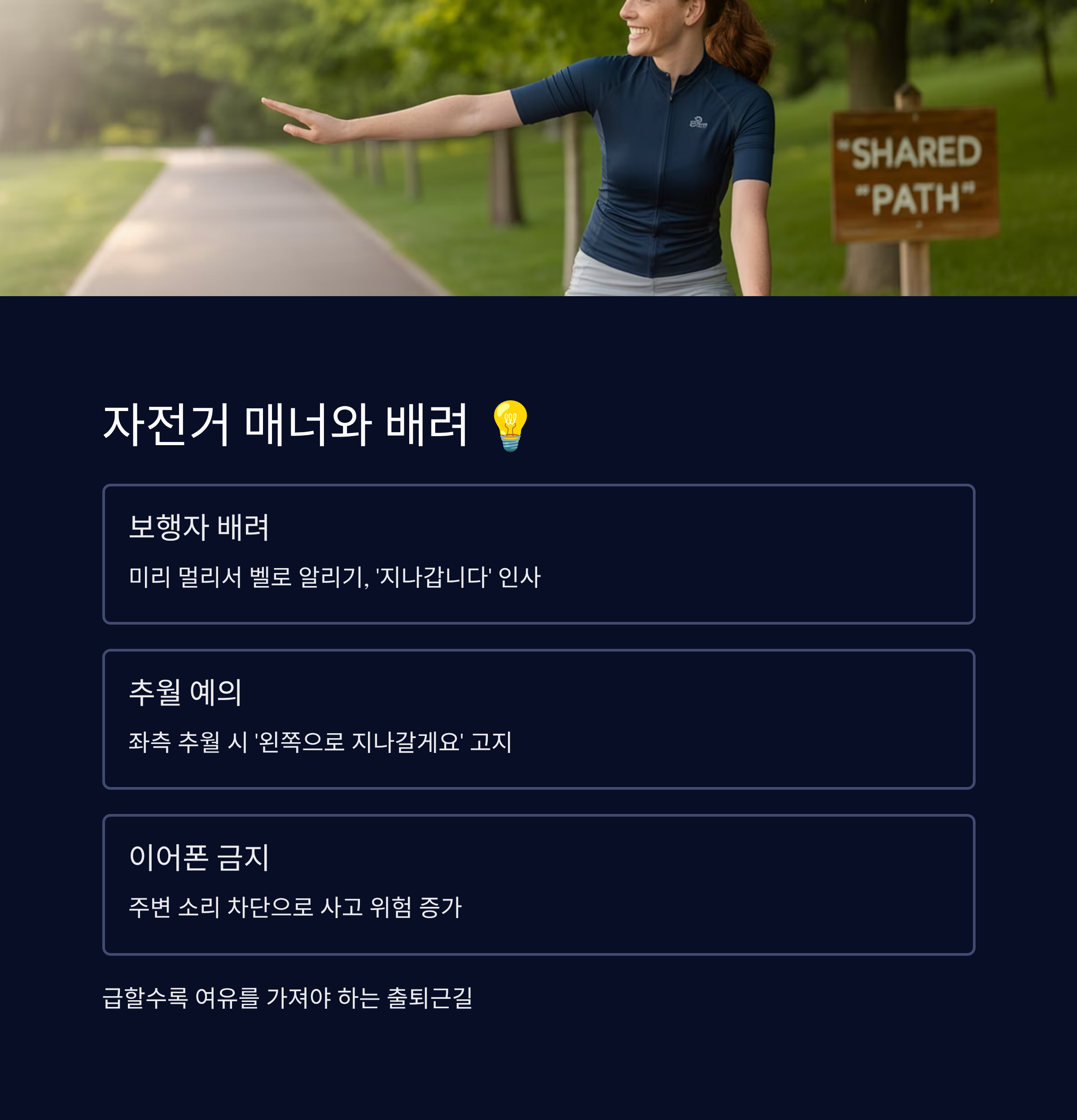 출퇴근길은 모두가 바쁜 시간이지만, 급할수록 여유를 가져야 해요. 급하게 타는 자전거보다 여유 있게, 타인과 조화를 이루며 달리는 자전거가 훨씬 더 아름답답니다. 도로 위 매너는 결국 나를 위한 안전벨트예요 😊