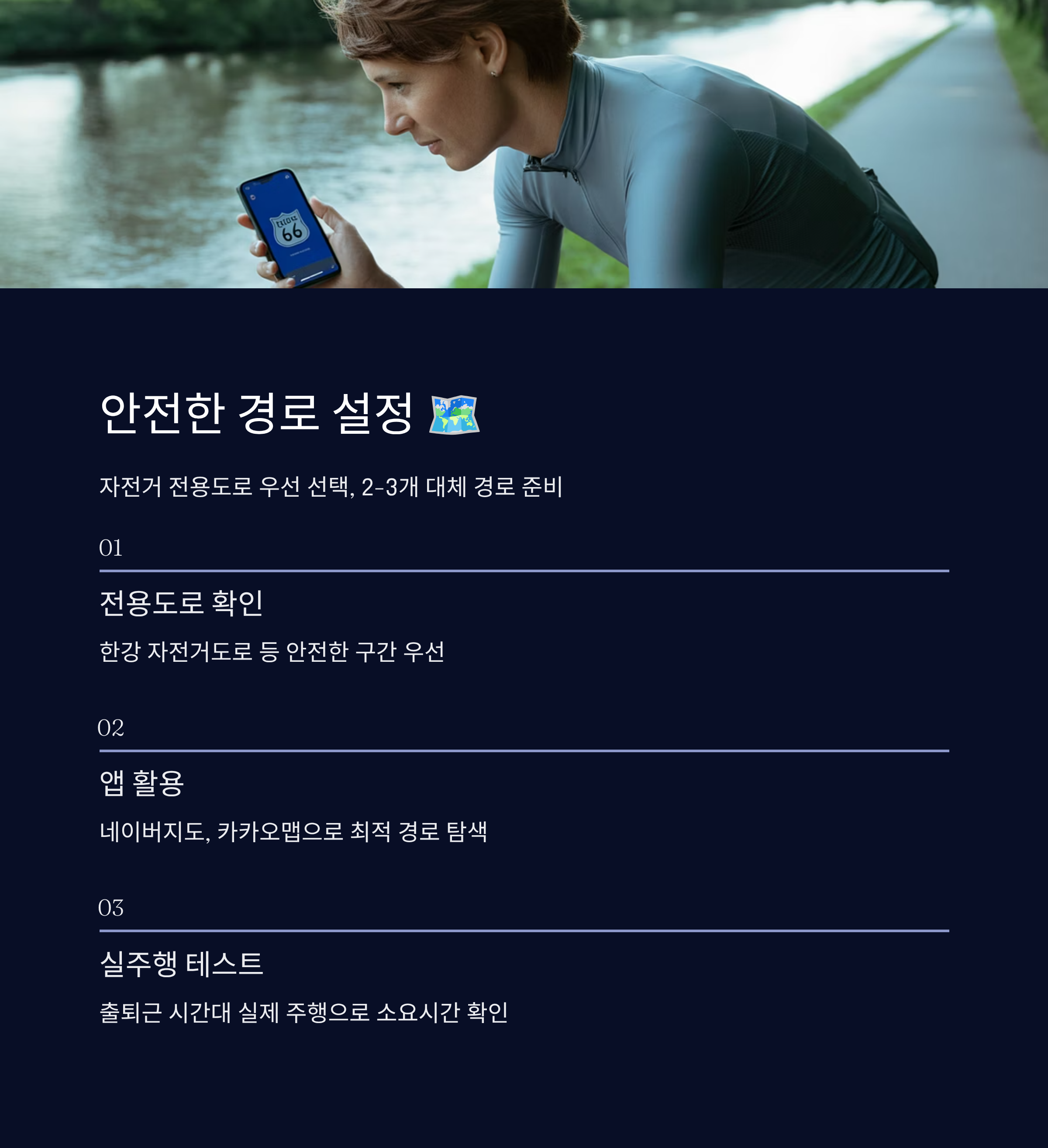 요즘은 모바일 앱도 잘 되어 있어서, ‘네이버 지도’, ‘카카오맵’, ‘스트라바’, ‘라이드위드GPS’ 같은 앱을 활용하면 자전거 전용 경로와 고도 차이, 거리, 예상 소요 시간까지 확인할 수 있어요. 출퇴근 시간이 정해져 있다면, 실제로 주행 테스트를 해보고 최적의 시간을 찾는 것이 중요해요.