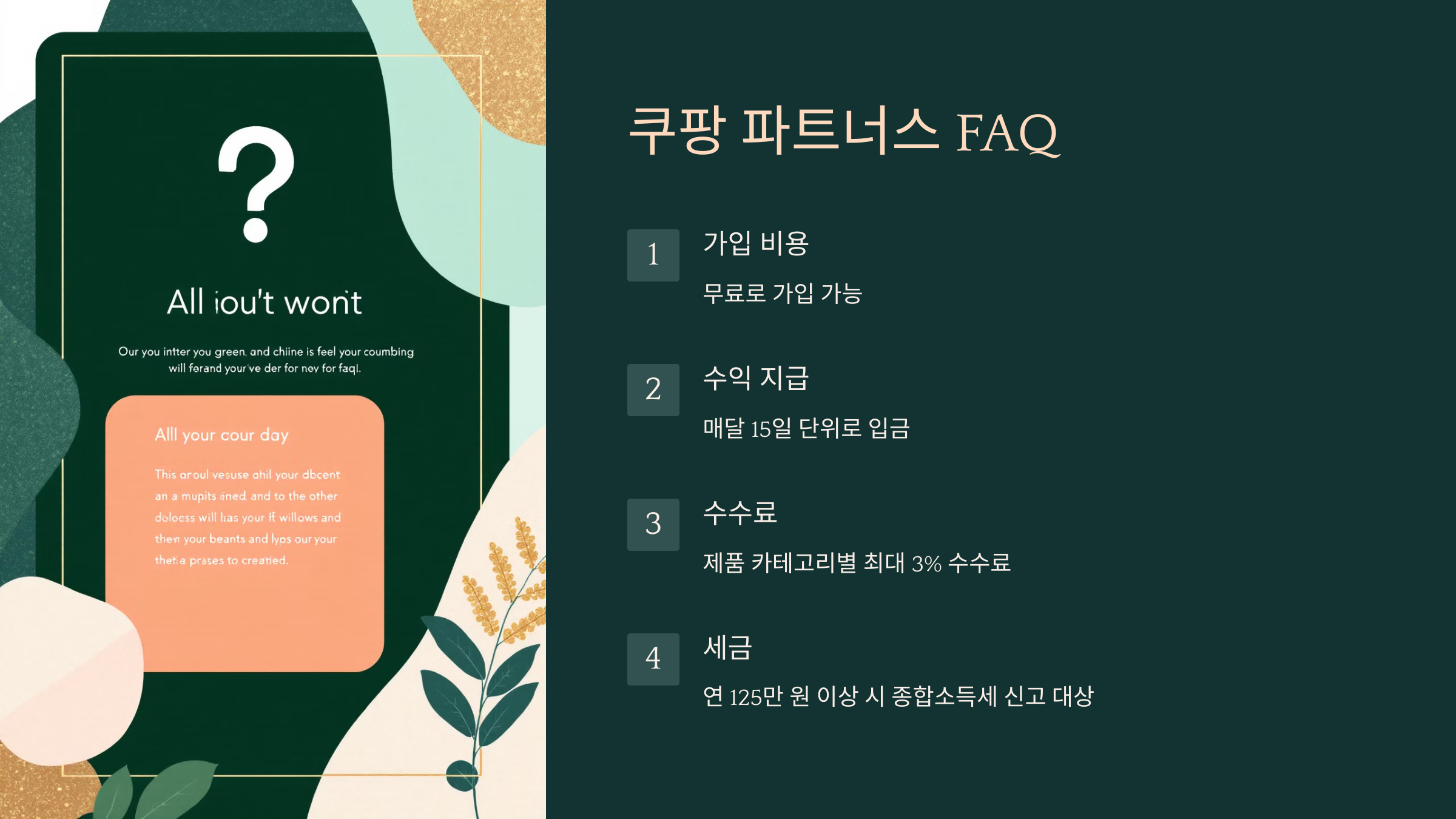 A1. 아니요! 쿠팡 파트너스는 **무료로 가입**할 수 있어요. 초기 비용 없이 누구나 쉽게 시작할 수 있다는 점이 가장 큰 장점이에요. 🎉