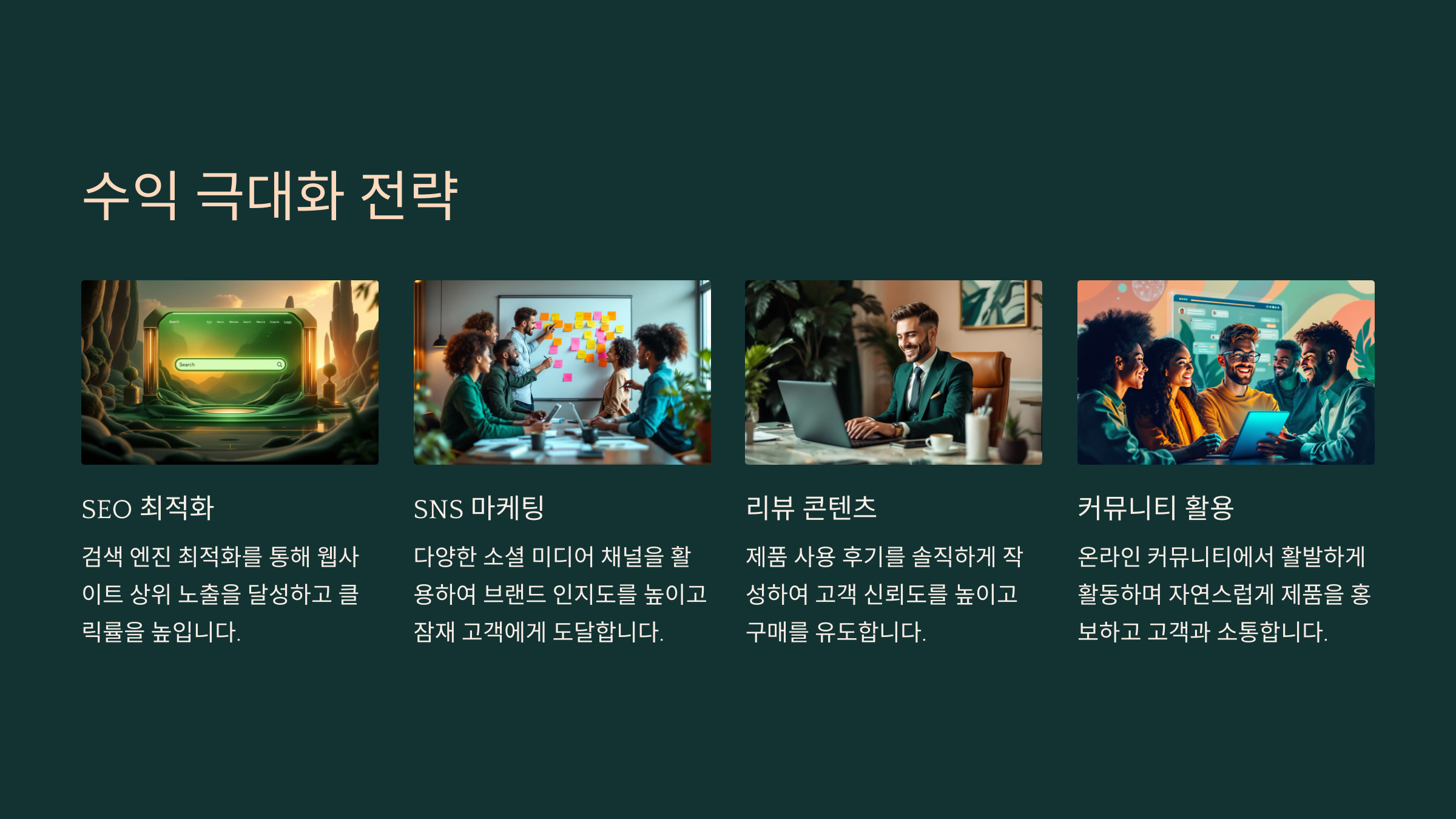 1️⃣ **SEO 최적화 블로그 운영** 검색엔진에서 상위 노출되면 더 많은 사람들이 링크를 클릭하게 돼요. 키워드 리서치를 통해 사람들이 자주 검색하는 제품과 관련된 콘텐츠를 작성하는 것이 중요해요.