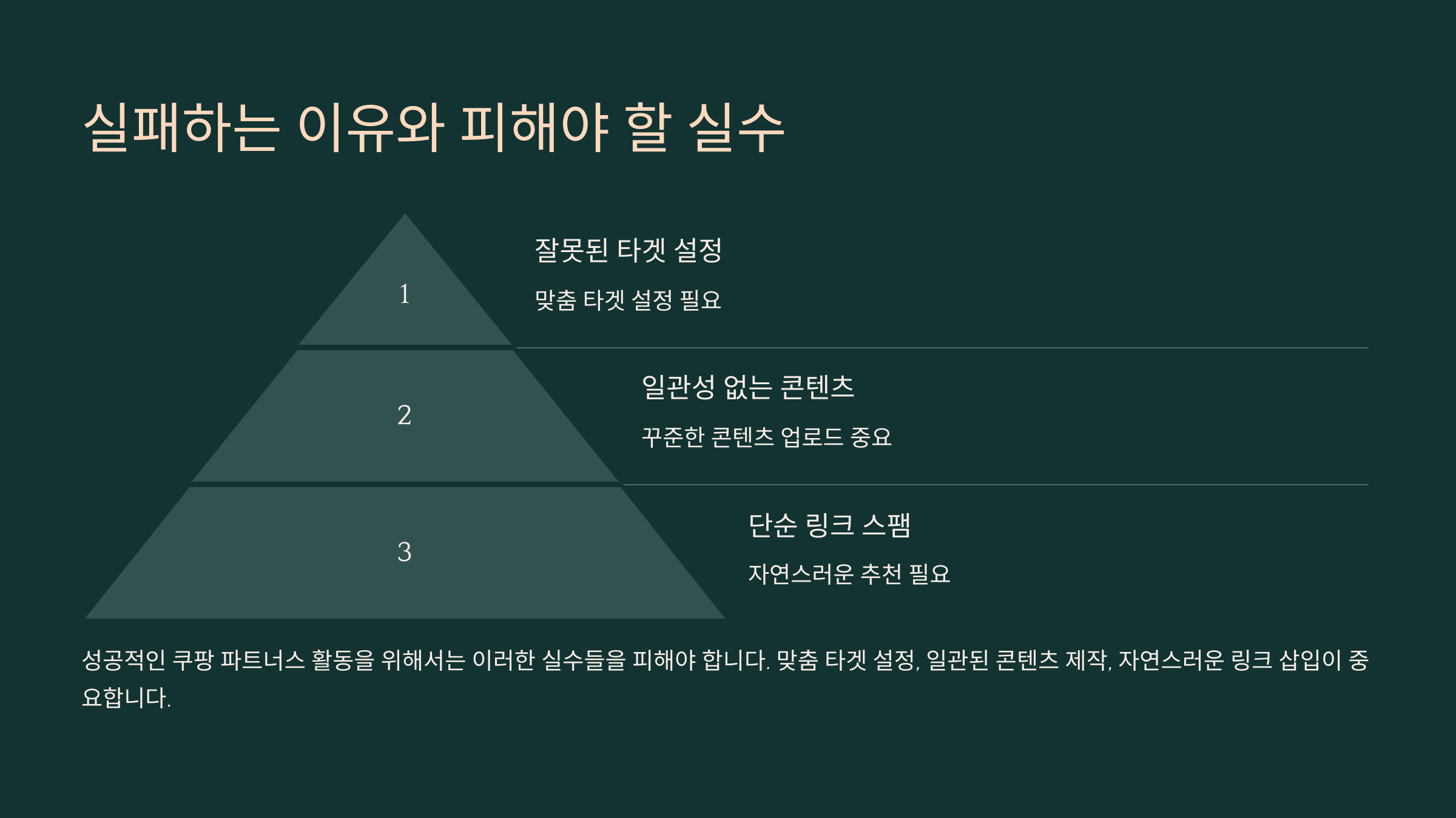 🚨 많은 사람들이 쿠팡 파트너스를 시작했다가 **수익을 내지 못하고 포기**하는 경우가 많아요. 실패하는 대표적인 이유를 정리해 봤어요.