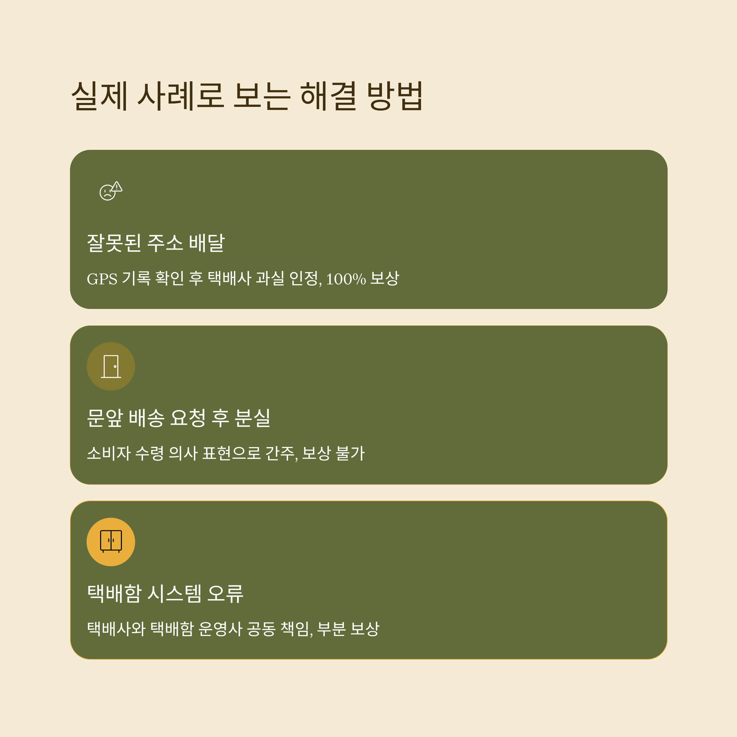 📍 **사례 1: 배송완료 상태인데 물건이 없음** 김모 씨는 온라인 쇼핑몰에서 8만원 상당의 전자제품을 구매했어요. 배송 조회는 ‘배송완료’로 나왔지만 실제로 물건이 도착하지 않았죠. 김 씨는 택배사에 바로 연락했고, 택배사는 GPS 기록과 배달 사진을 확인한 결과 배송 기사가 다른 주소에 잘못 배달한 것이 밝혀졌어요. 이후 김 씨는 100% 보상받았답니다.