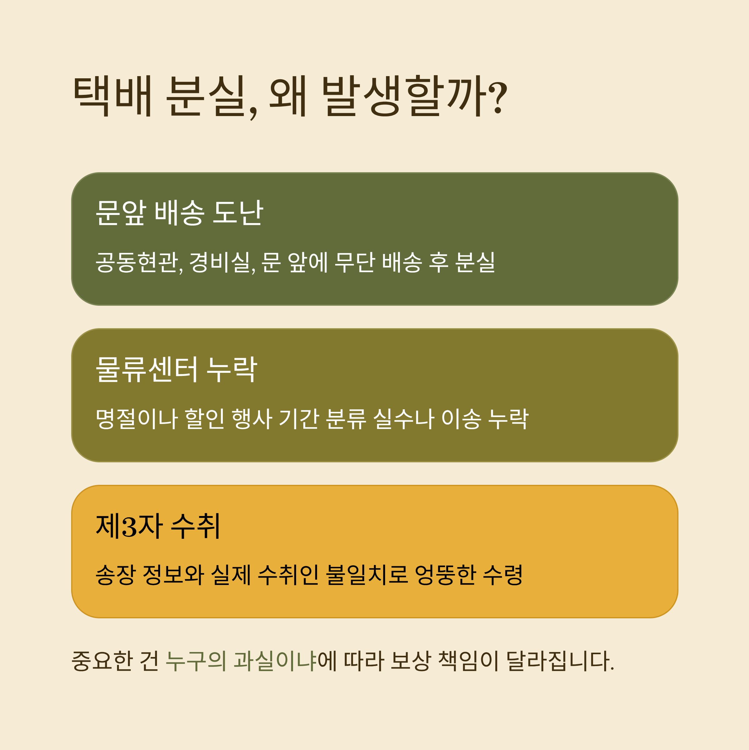 택배 분실은 생각보다 다양한 원인으로 발생해요. 가장 흔한 경우는 택배기사가 배송 완료 처리를 했지만, 수취 장소에 놓고 간 후 도난당하거나 분실되는 경우에요. 특히 공동현관 앞, 경비실, 문 앞에 무단으로 놓는 '문앞 배송'이 원인인 일이 많답니다.