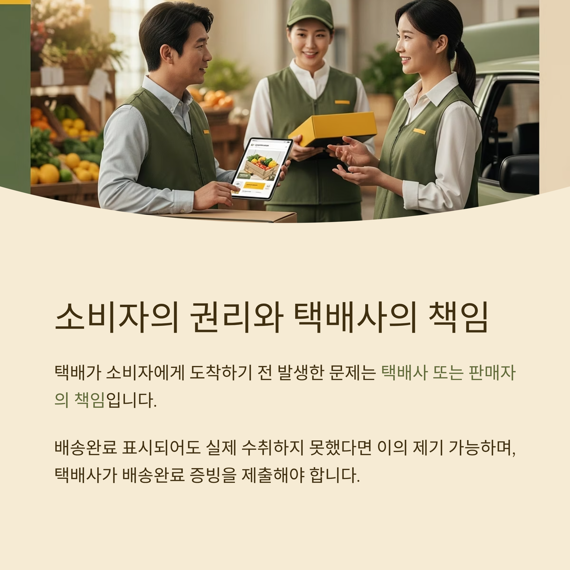 공정거래위원회의 표준약관에 따르면, 배송 완료 표시가 되어 있어도 실제 수취하지 못했다면 소비자는 이의를 제기할 수 있어요. 이 경우 택배사는 배송완료 증빙(사진, GPS기록 등)을 제출해야 하고, 입증 책임이 택배사에 있어요.