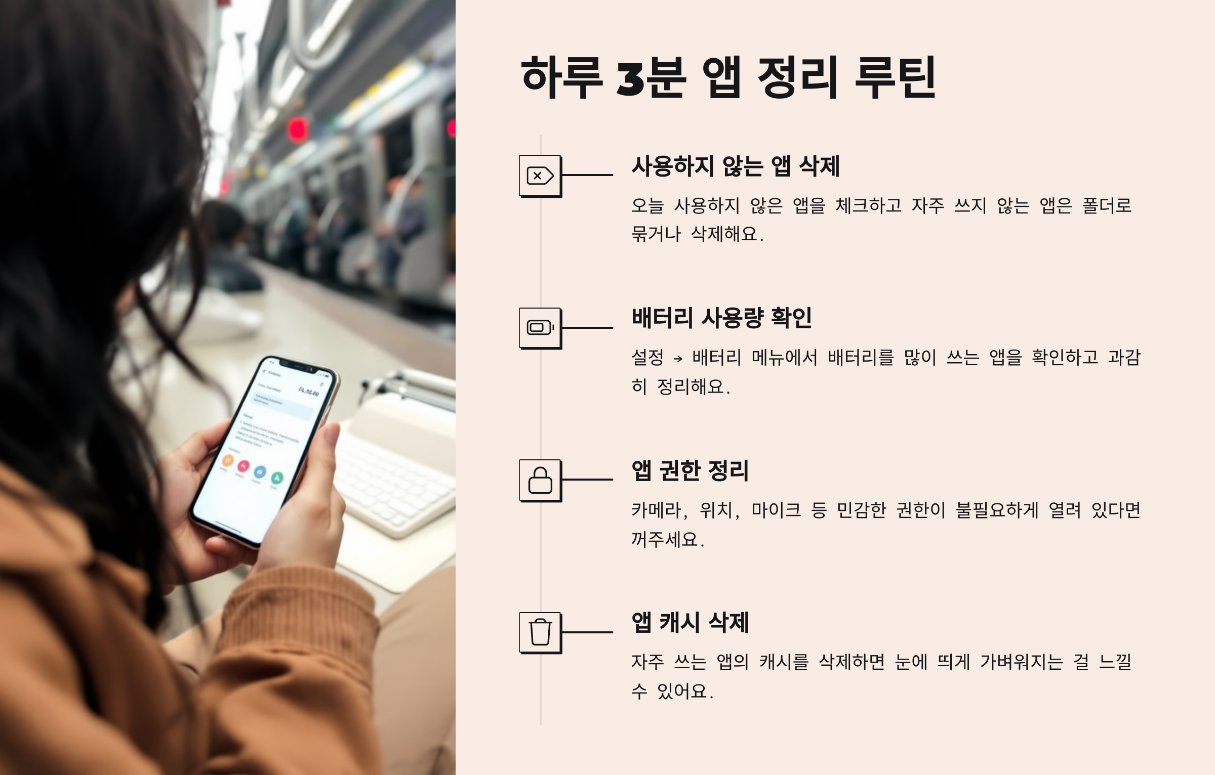 나도 매일 아침 지하철에서 3분 정도 앱을 정리하는 습관을 들였는데, 체감상 배터리가 훨씬 오래가고 속도도 한결 부드러워진 느낌이에요. 🚄