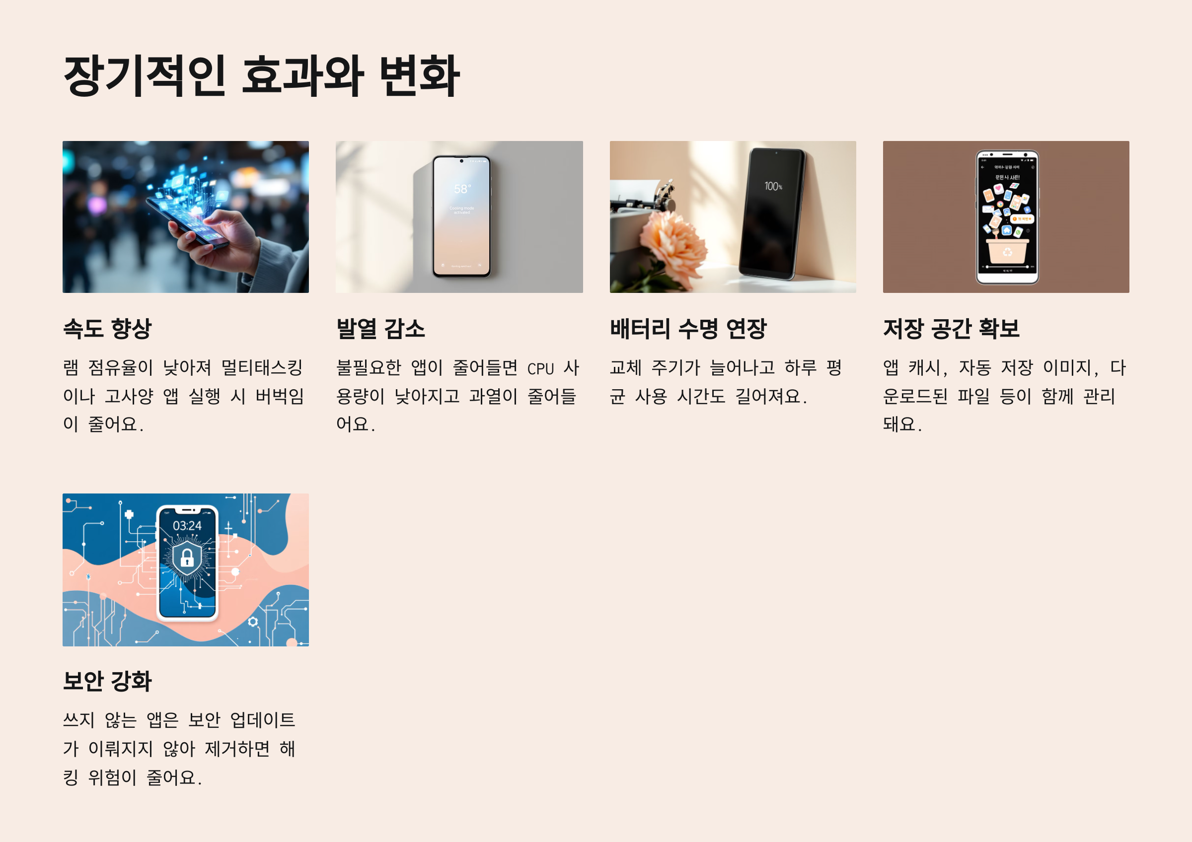 그리고 발열 감소도 확실히 느껴져요. 불필요한 앱이 줄어들면 CPU 사용량이 낮아지고, 과열이 줄어드니 기기 수명도 자연스럽게 늘어나요.