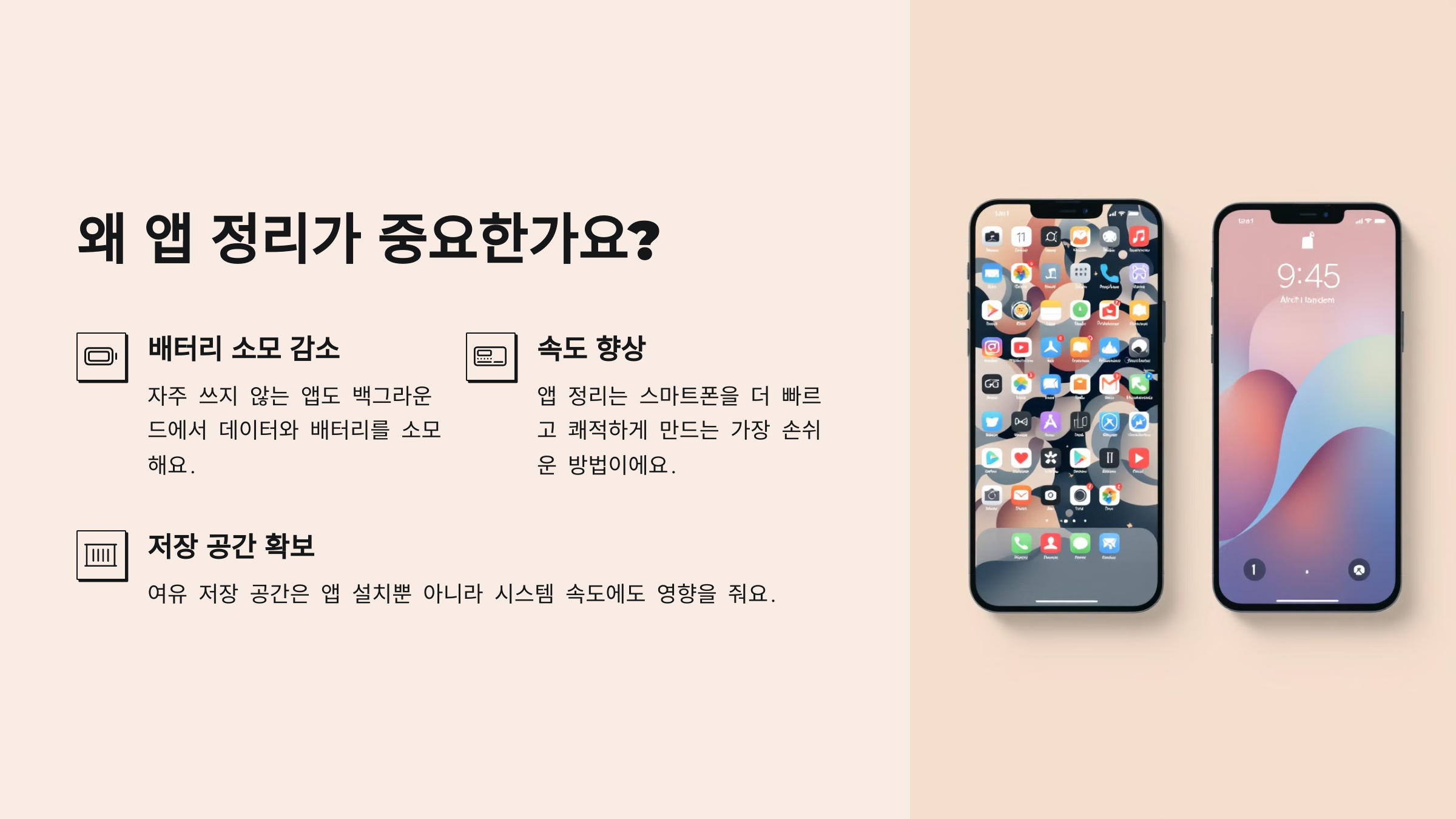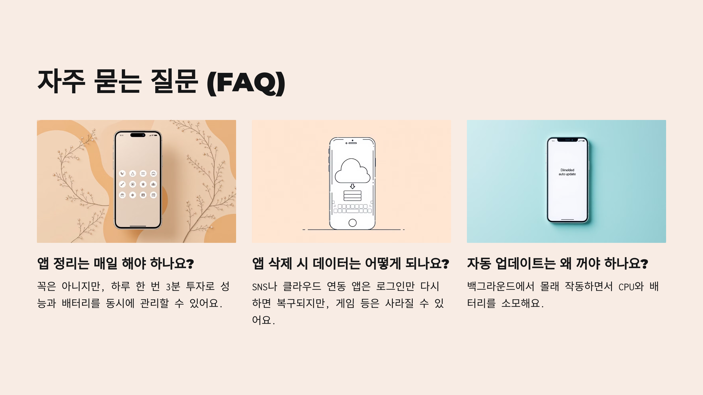 앱 정리는 곧 배터리 정리예요. 하루 3분의 정리 습관이 몇 년의 스마트폰 수명을 바꿀 수 있어요. 📲👍