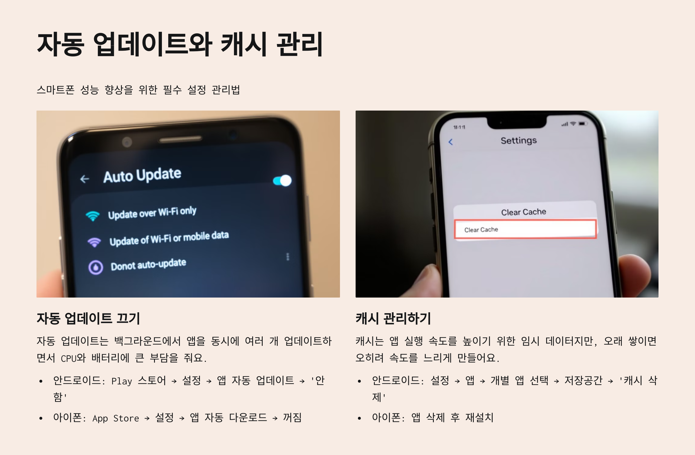 스마트폰 속도를 느리게 만드는 두 가지 주범이 있어요. 바로 '자동 업데이트'와 '앱 캐시'예요. 이 둘을 잘 관리하면 성능이 확 달라져요. 🚀