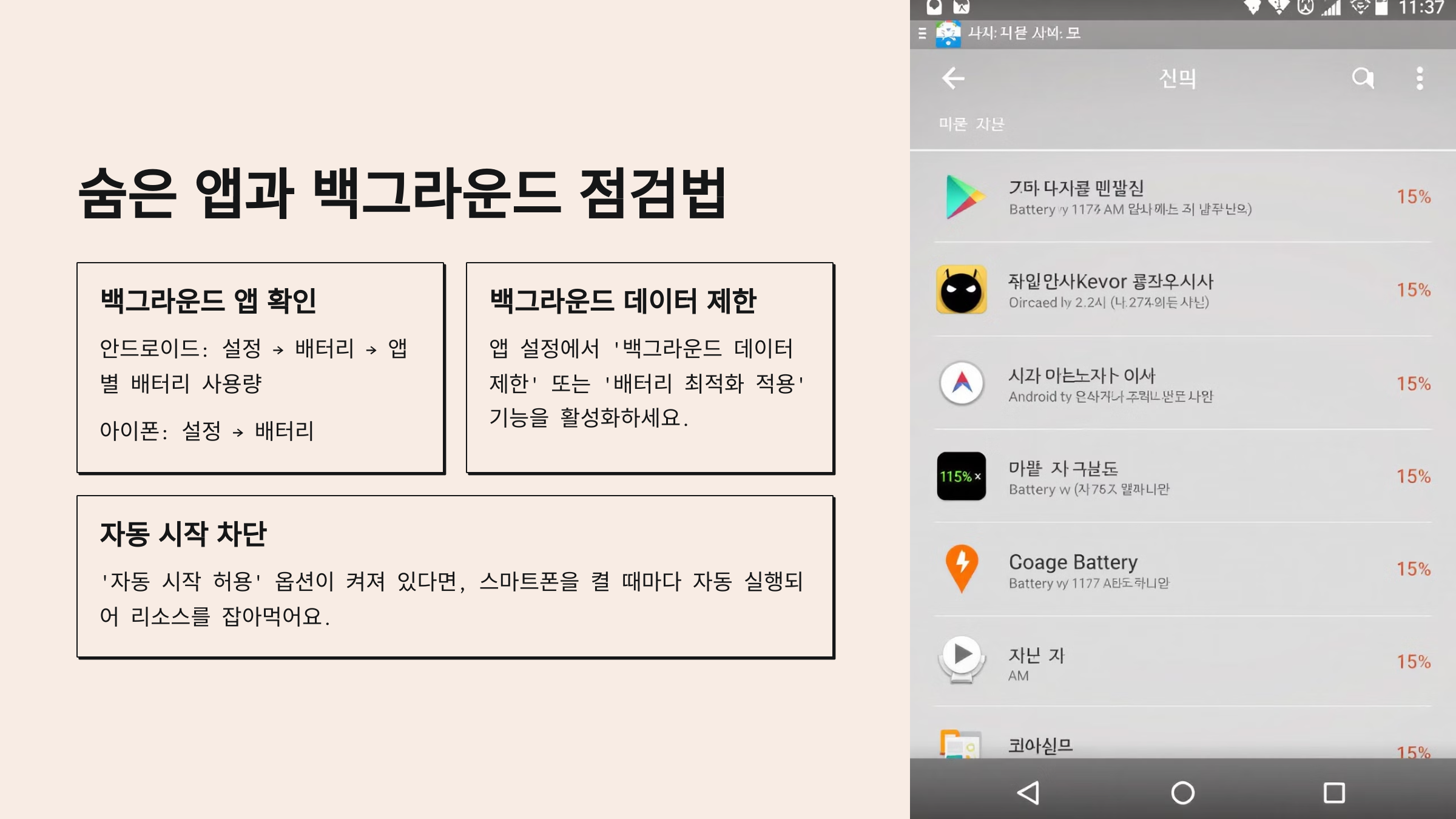 스마트폰에서 가장 무서운 앱은 자주 쓰는 앱이 아니라, **몰래 돌아가는 앱**이에요. 직접 실행하지 않아도 백그라운드에서 배터리를 줄줄 새게 만들죠. 🕳️