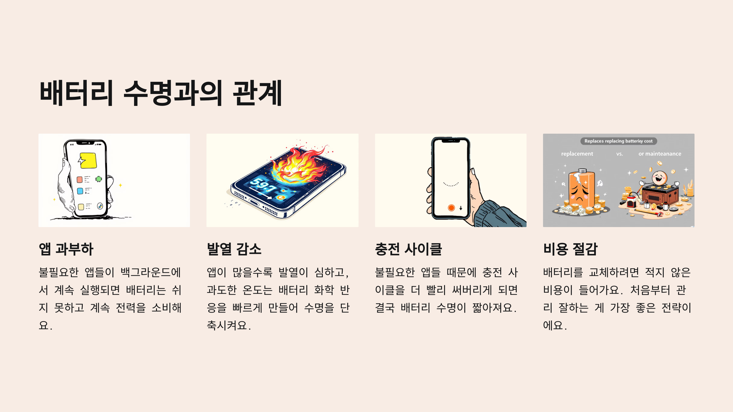 앱 정리는 단지 스마트폰을 깔끔하게 만드는 것뿐만 아니라, **배터리 수명**에도 큰 영향을 미쳐요. 실제로 배터리 성능 저하의 원인 중 하나가 '앱 과부하'예요.