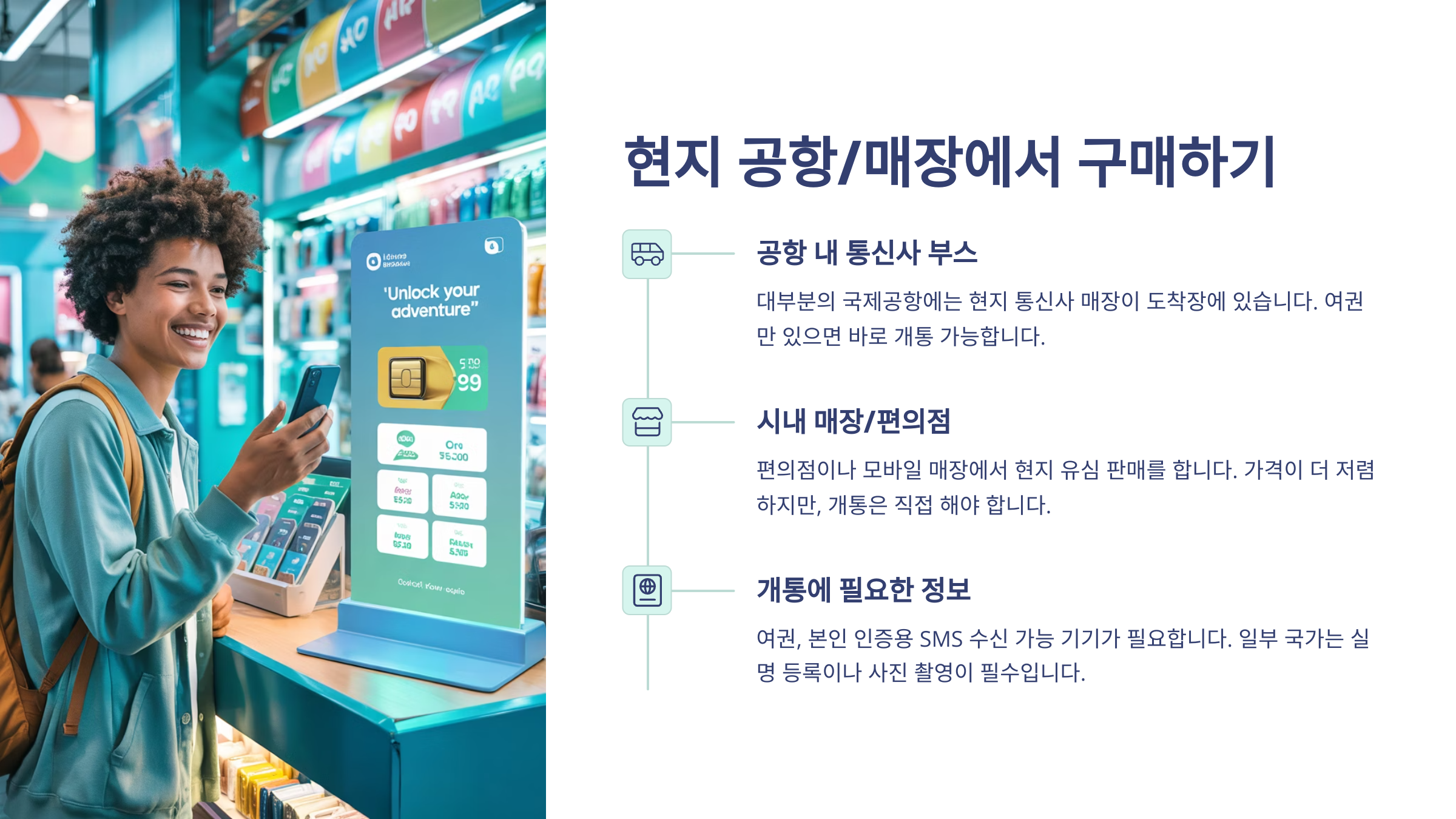 현지에서 직접 유심을 사는 건 즉시 사용 가능하고, 가격도 저렴한 경우가 많아서 여행자들이 많이 선택하는 방법이에요. 특히 장기 체류자나 현지 통신망을 정확히 알고 싶은 분들에게 유리해요.