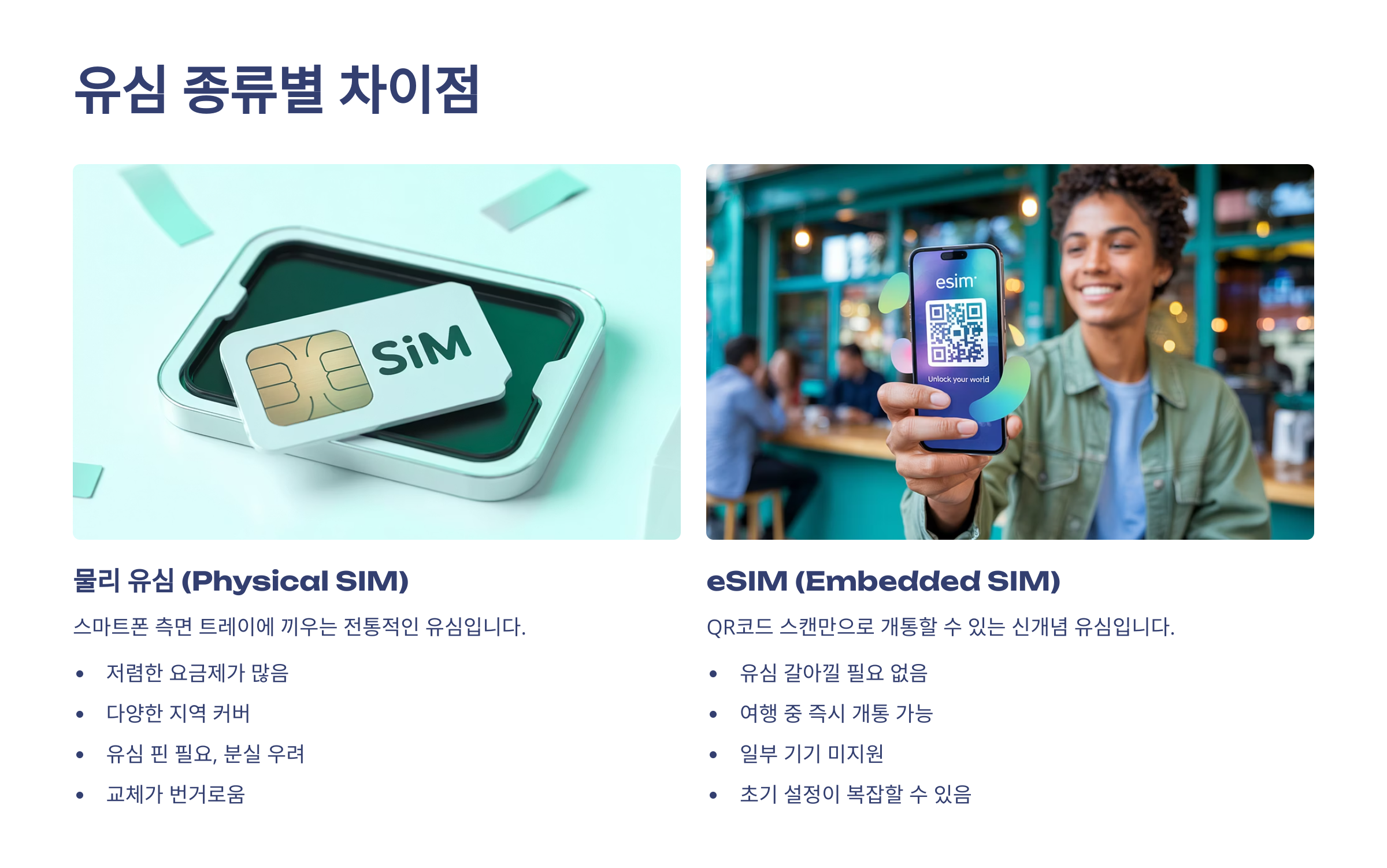 이제 다음 섹션에서는 유심 종류별 차이점을 알아볼게요! 물리 유심 vs eSIM, 어떤 게 더 좋을까요? 🤔