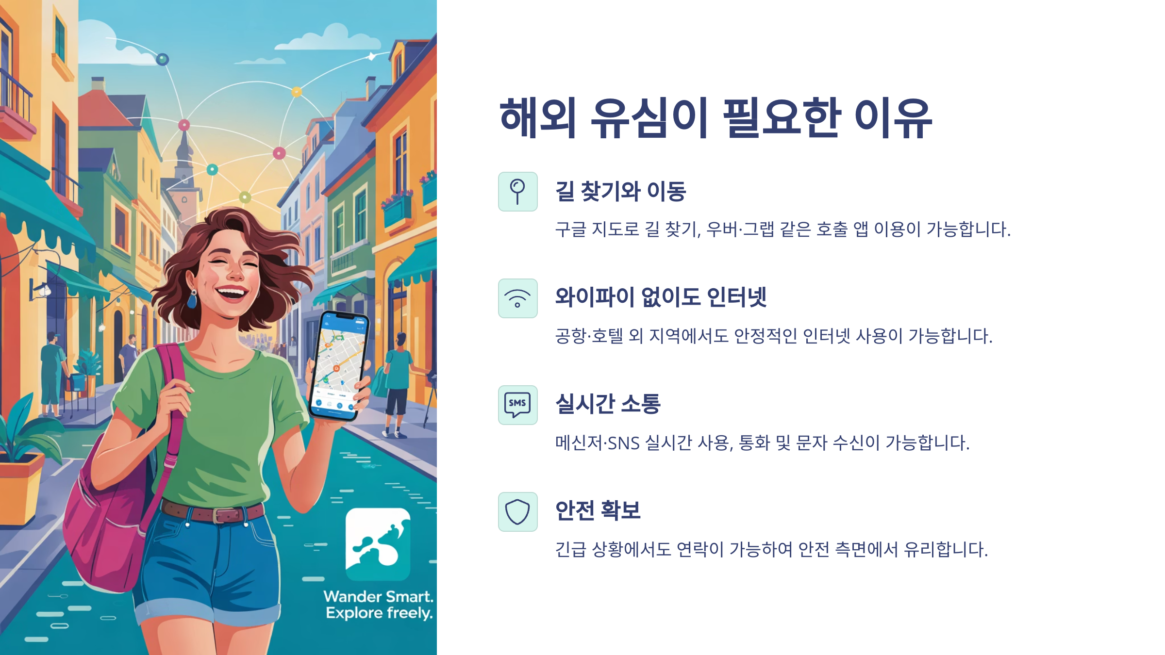 로밍보다 저렴하고, 와이파이보다 안정적인 유심은 특히 자유여행자나 장기 출장자에게 최적이에요. 내 데이터를 마음껏 쓸 수 있으니, 여행의 자유도와 만족도가 확 올라가죠 😄