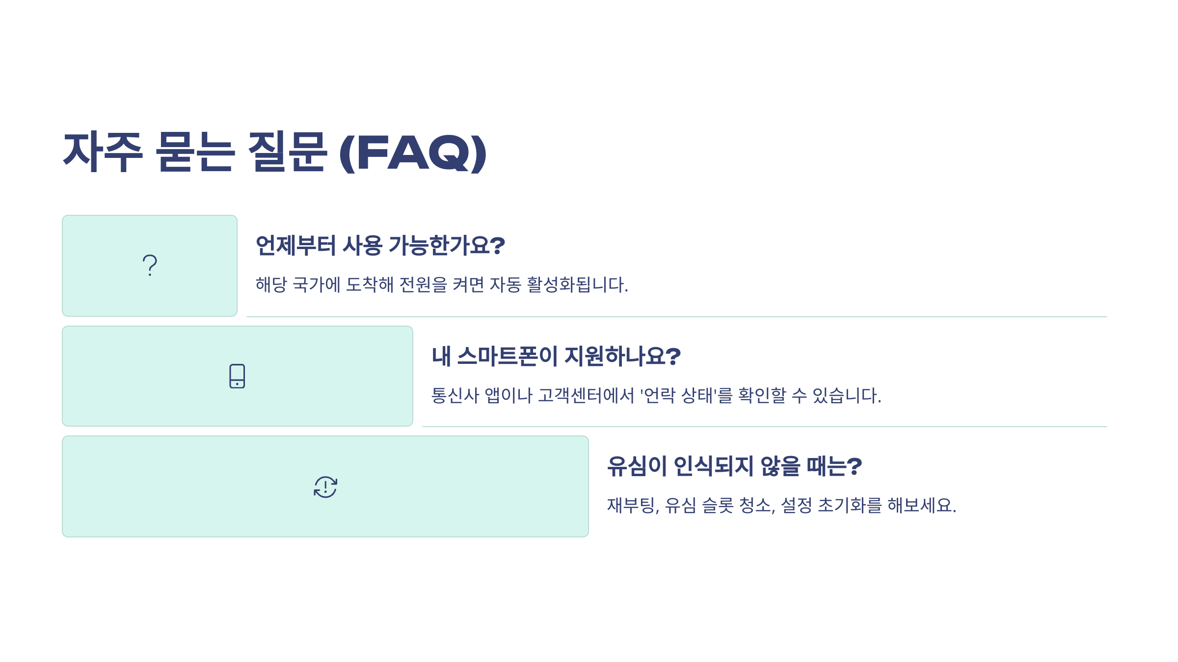 이제 마지막으로 해외 유심 관련 FAQ 8가지를 정리해서 알려드릴게요! 실시간으로 많이 궁금해하는 내용이에요 ✨