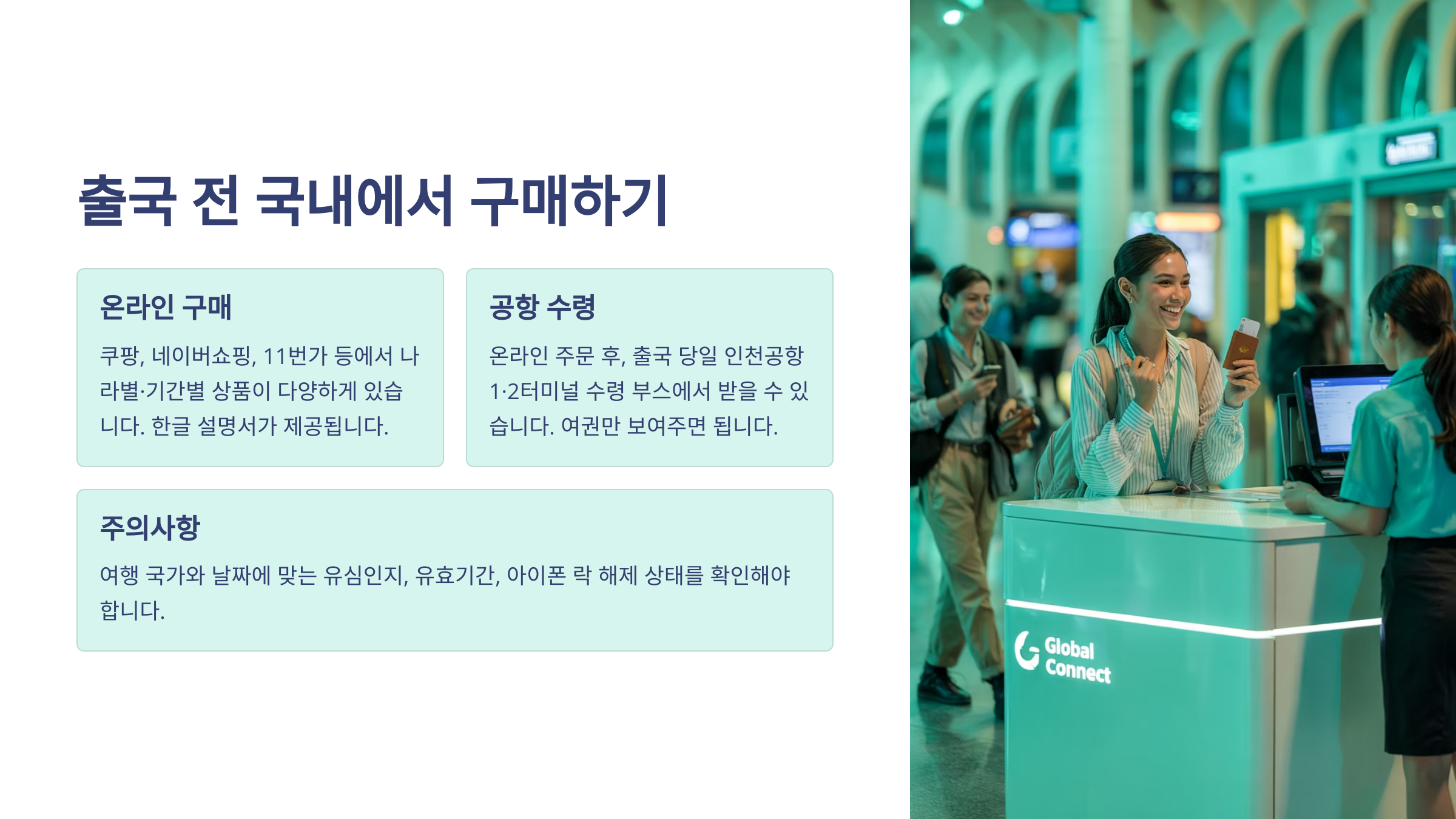 해외 유심은 현지에서만 구입하는 게 아니라, 출국 전에 미리 한국에서 구매할 수도 있어요. 요즘은 온라인 쇼핑몰이나 공항 내 판매부스에서도 다양한 유심을 사전 구매할 수 있어요. 특히 언어 문제 걱정 없는 점이 가장 큰 장점이에요.
